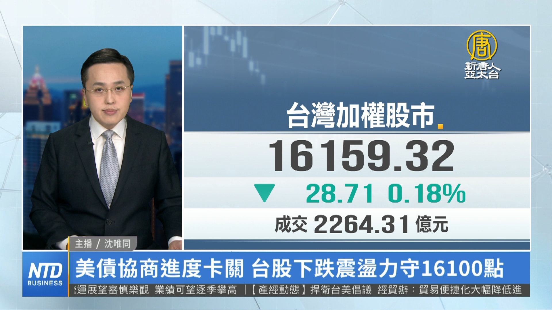 【新唐人亞太台 2023 年 05 月 24 日訊】新聞一開始帶您看到金融市場,美國債務上限協商,遲未達成協議,造成市場出現調節賣壓,美股週四齊跌。台股今天盤中跌逾百點,跌破16100點,但下午1點過後指數急拉,尾盤逼近平盤,收盤加權指數小跌28.71點。8大類股漲跌互見,造紙類股表現強勢,營建類股也上漲,機電、金融類股則是收黑,分析師表示,台股要等到電子業景氣轉佳,才有機會出現一波漲勢,短期關注美國債務上限協商進度,以及外資進出走向。