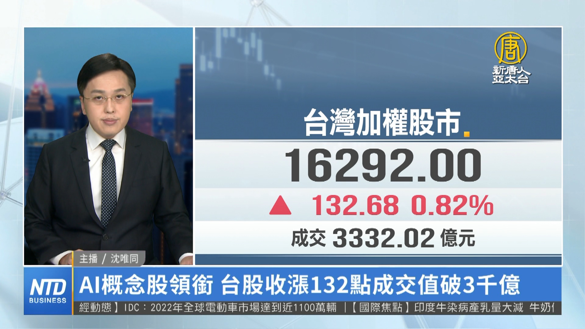 【新唐人亞太台 2023 年 05 月 25 日訊】新聞一開始帶您關心金融市場,儘管美債問題尚未解決,美股周三下跌,不過受惠GPU大廠輝達利多消息,帶動美股盤後表現,那斯達克電子盤指數期貨,上漲1.62%,科技股一掃多天的負面消息。台股今(25)日由台積電、AI概念股領銜強攻,大盤早盤再創波段高點,創意、技嘉、欣興等類股,以及封測龍頭日月光、京元電子,都有不錯表現。終場台股收漲132.68點,收在16292點,成交量來到3325億。