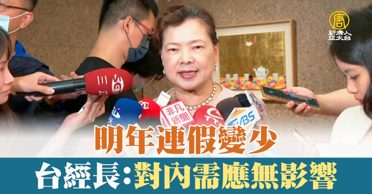 【新唐人亞太台 2023 年 05 月 25 日訊】明年3天以上連續假期只剩4個,連假減少是否會影響台灣內需?經濟部長王美花回應表示,放假總天數並沒有改變,也對台灣內需有信心。