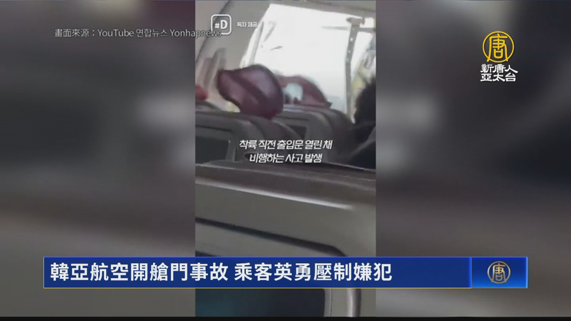 【新唐人亞太台 2023 年 05 月 27 日訊】韓亞航空一架航班26日降落前,發生乘客開啟緊急逃生門事故。據鄰座乘客說,他是因為帽子跟耳機突然飛走才發現旁邊的逃生門打開了,當時因為不能解開安全帶,只能在有限的活動範圍內伸出雙手費力壓制嫌犯,在兩人糾纏時,3、4名空服員趕上前來協助,其他乘客也陸續加入幫忙將嫌犯拖到機艙的走道上,因此才避免發生跳機的憾事。