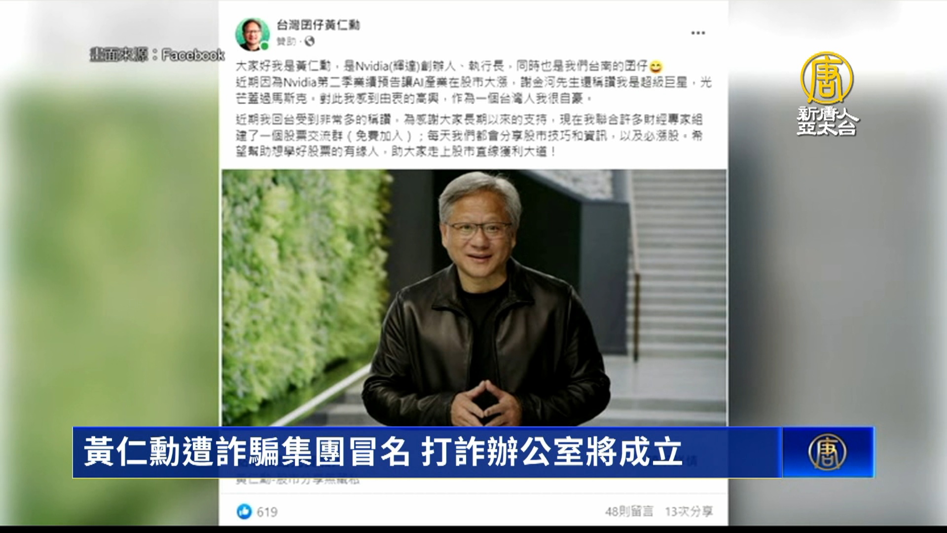 【新唐人亞太台 2023 年 05 月 30 日訊】輝達(Nvidia)執行長黃仁勳來台受到關注,社群媒體臉書隨即出現,盜用黃仁勳身分的,詐騙股票群組訊息。台北市電腦公會與13家業者,舉行反詐騙宣導記者會,表達業界自律防詐的決心,行政院長陳建仁今天也出席活動,他表示近期有詐騙集團冒用黃仁勳的名義,在Meta協助下,將廣告立刻下架,行政院「打詐專責辦公室」明天將揭牌,公私協力,一同幫助民眾識別詐騙訊息。