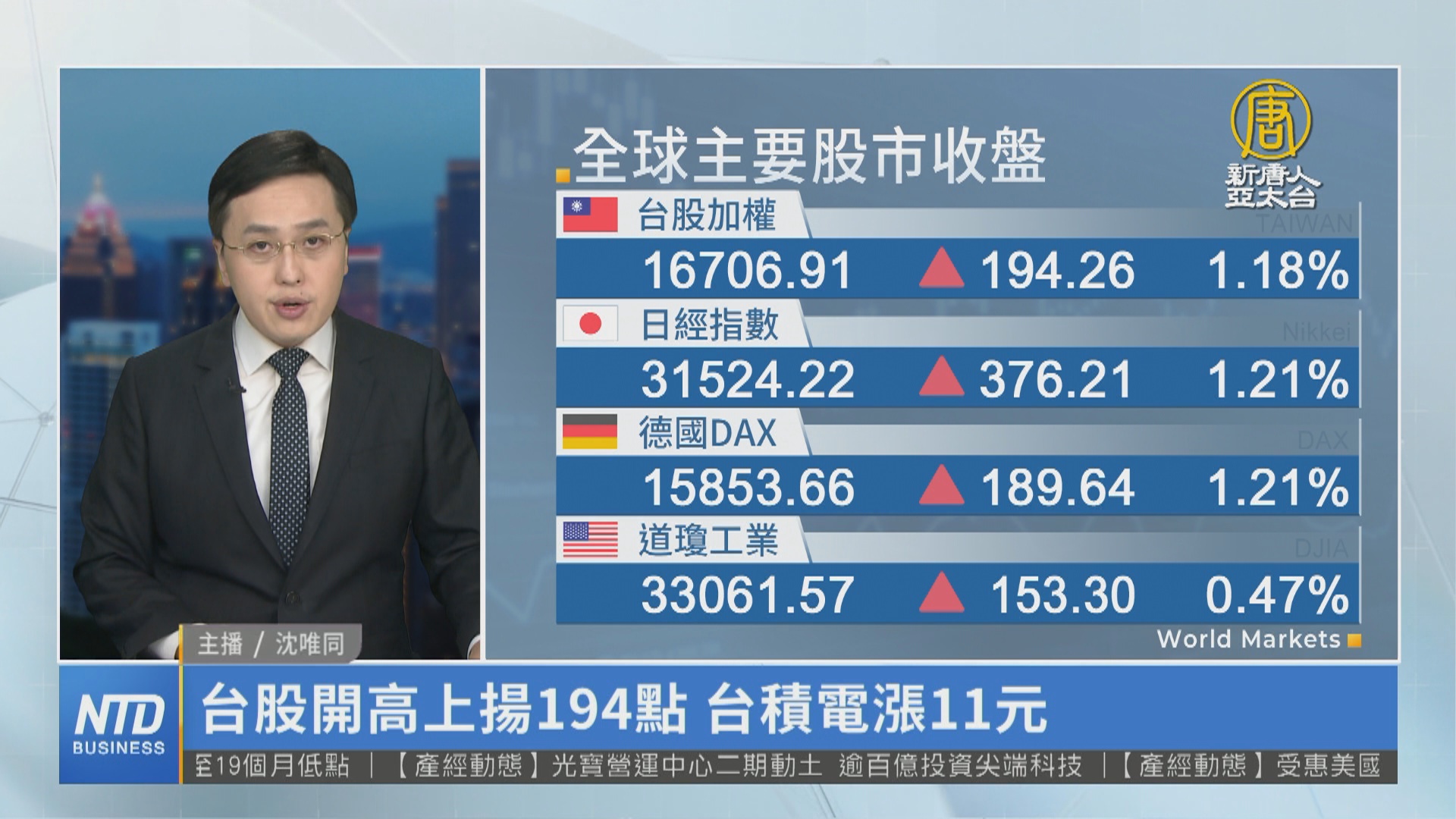 【新唐人亞太台 2023 年 06 月 02 日訊】聯準會(Fed)6月,傳出可望暫緩升息,再加上國會兩黨投票確定提高舉債上限,美國四大指數全面收高,那斯達克上漲1.28%、費半指數上漲1.55%。台股今(2)日開高走高,權值股台積電,帶頭上攻,市值逼近15兆新台幣,台股盤中最高來到16752.20點,尾盤合計上漲194.26點,電子、資訊服務、汽車、電機、電腦週邊等類股,漲幅明顯,不過隨著加權指數上揚,分析師也提醒追高風險上升,投資人須審慎評估。