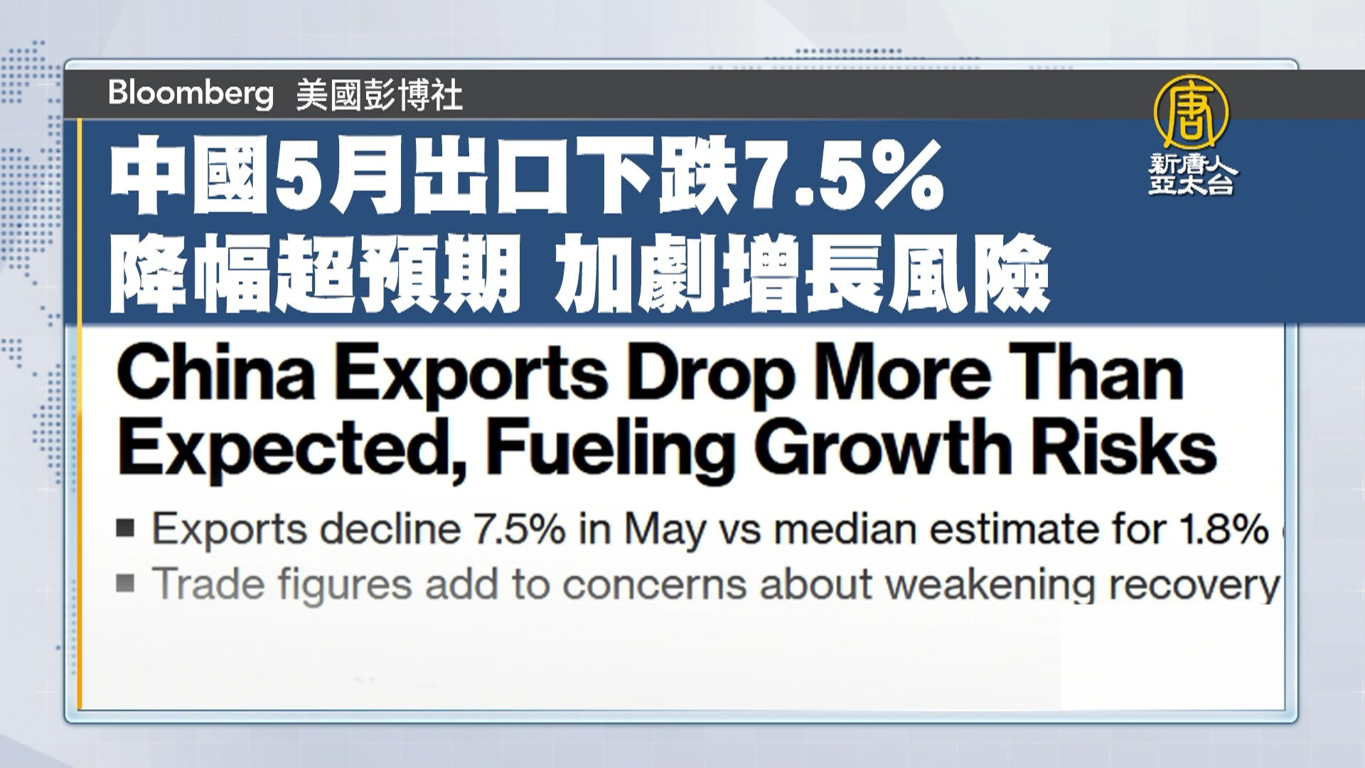 彭博社報導,中國5月出口下跌7.5% 降幅超預期 加劇增長風險。