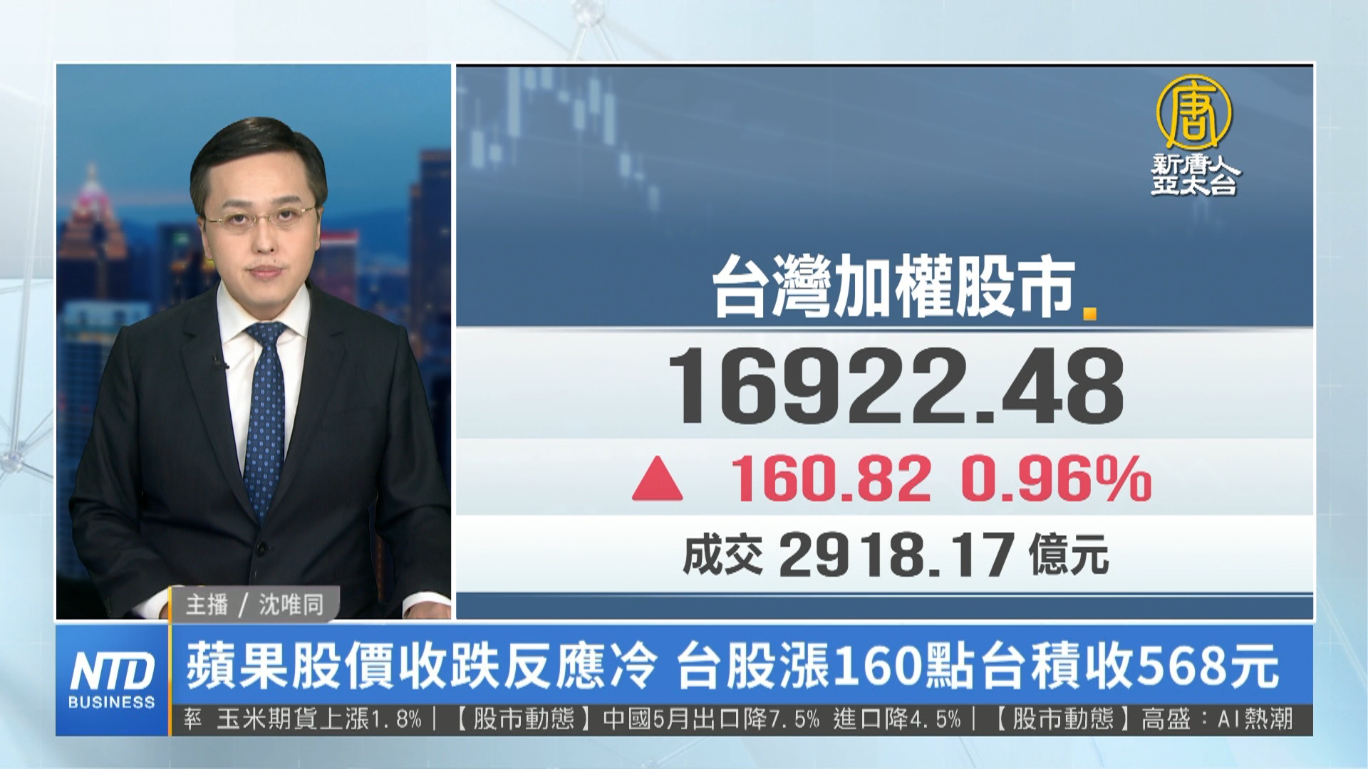 【新唐人亞太台 2023 年 06 月 07 日訊】新聞一開始帶您看到國際股市。美國股市週二小漲,標普500指數和納斯達克綜合指數,創下近一年來新高;不過蘋果股價在新品發表後反應冷淡,5日收跌0.76%,來到179.58美元。台股方面,AI族群與權值股帶動漲勢。台股今天(7日)收盤上漲160.82點,收盤指數16,922.48點,成交量為2,911.7億元。權值股台積電領漲,收盤上漲8元、收盤價568元;帶動台達電、廣達、聯發科和日月光投控貢獻大盤最多。觀光類股、電子零組件及電腦周邊表現亮眼。不過電子通路、玻璃、光學鏡片則是表現疲弱。
