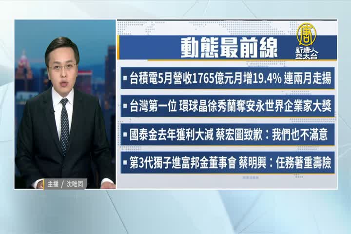 【新唐人亞太台 2023 年 06 月 09 日訊】帶您看到今天的產業動態。台積電5月營收持續攀升,達到新台幣1765.37億元,比4月再增加19.4%,連續2個月營收揚升,並創下4個月來新高。環球晶董事長徐秀蘭奪得今年「安永世界企業家大獎」冠軍,是獎項舉辦23年以來,第一次有台灣企業家拿下這項年度大獎。國泰金去年獲利僅新台幣380億元,董事長蔡宏圖向股東表示抱歉,承諾今年會盡最大努力,讓股東有比較滿意的成果。富邦金董事長蔡明興獨子蔡承儒首度進入金控董事會,蔡明興表示,蔡承儒進到經營核心,需更廣泛地學習、了解經營層面的問題、風險與核心價值,接下來任務則會偏重在壽險方面。