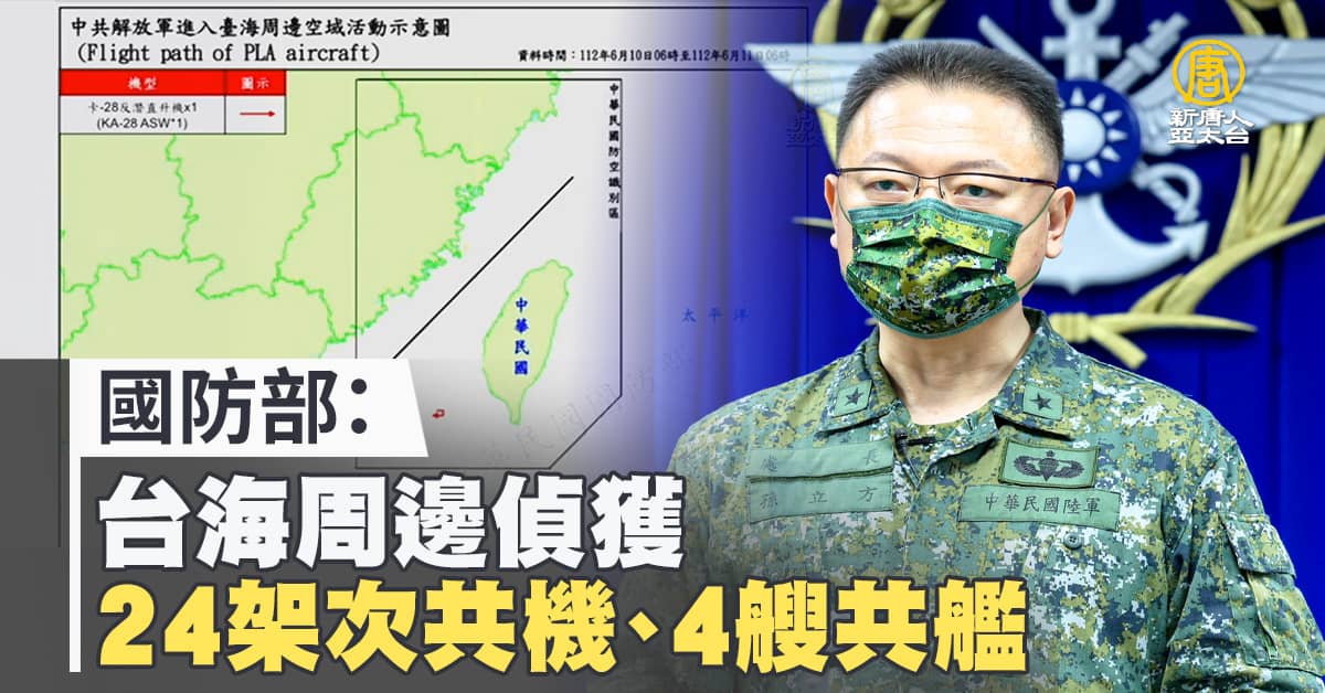 【新唐人亞太台 2023 年 06 月 11 日訊】中華民國國防部今天(11日)表示,截至下午兩點,在台海周邊偵獲24架次共機與4艘共艦,其中10架共機逾越台海中線,國防部發言人表示,國軍全程掌握共軍動態,並嚴密監控、應處。