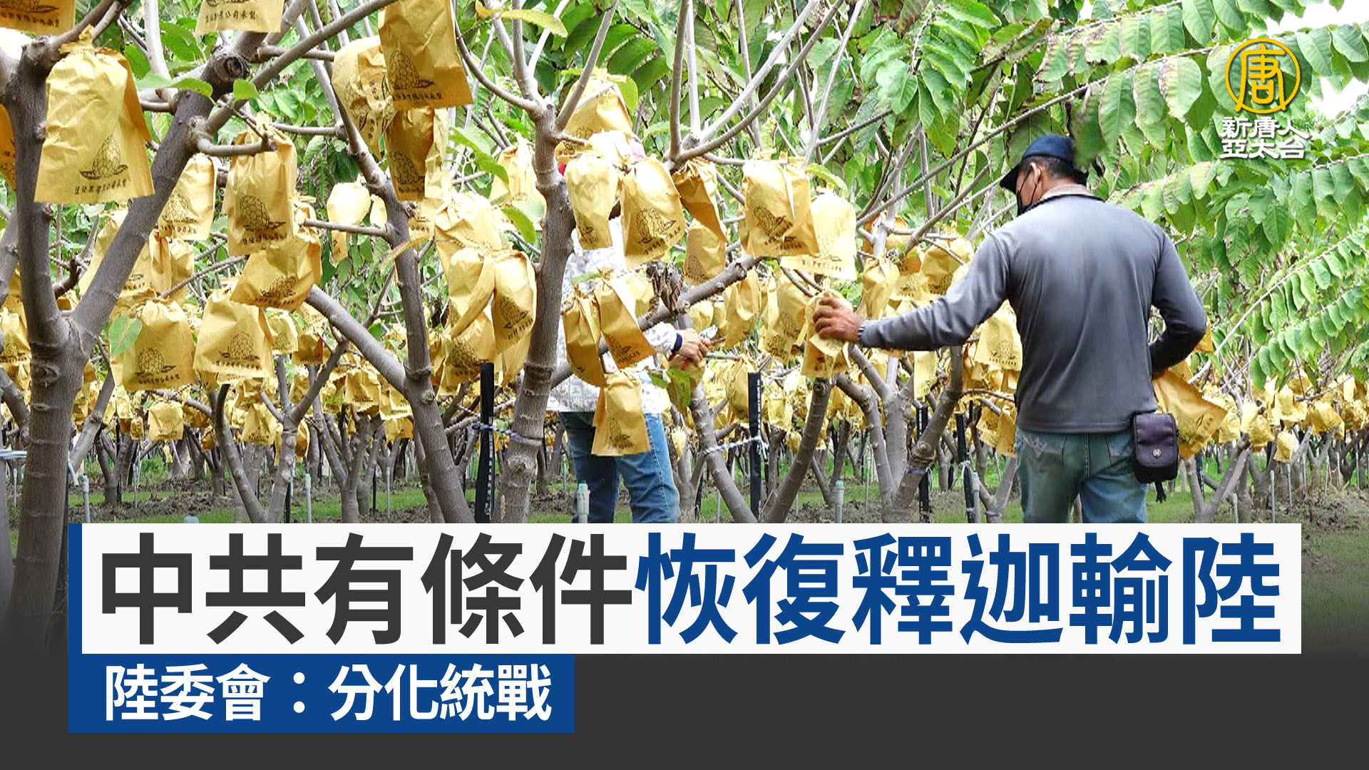 【新唐人亞太台 2023 年 06 月 20 日訊】再來看到,中共國台辦今天宣布,即日起恢復部分台灣釋迦輸入中國大陸。不過台灣農委會表示,中方有條件開放的部分,占整體台灣釋迦的比例非常少。陸委會則表示,這是中共在利用經濟利益,對台灣進行分化及統戰。