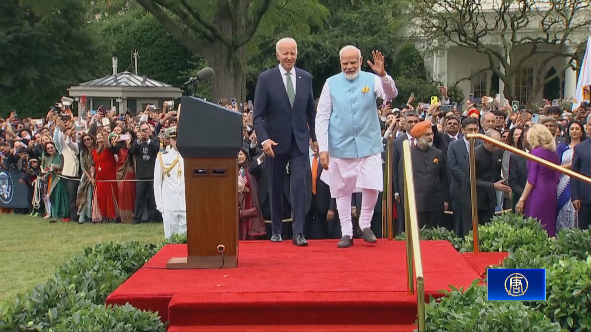 白宮南草坪,美國總統拜登伉儷鋪上紅地毯,以最高規格,歡迎印度總理莫迪,舉行盛大歡迎儀式,走到哪裡,都釋放出美印關係前所未有的好,雙方共同宣布一系列重大國防、晶片和商業協議。