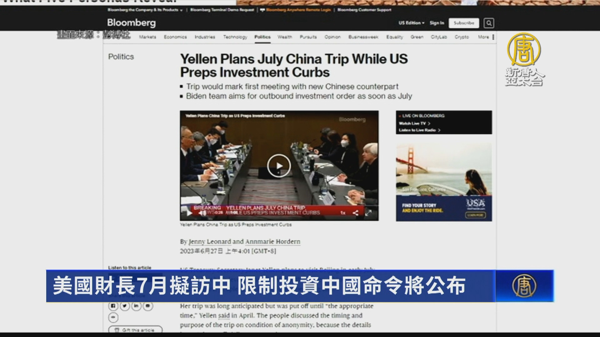 【新唐人亞太台 2023 年 06 月 27 日訊】帶您看到,據《彭博社》報導,美國財政部長葉倫(Janet Yellen)計畫將在7月初訪問北京,會見今年3月才接棒,負責經濟事務的中共國務院副總理何立峰。若此行確定,將是美中關係因間諜氣球事件陷入緊張後,首位訪中的最高層級經濟官員。另外報導也提及,拜登政府近日正加速研擬限制投資中國的最新行政命令,最快將在7月底前公布內容。