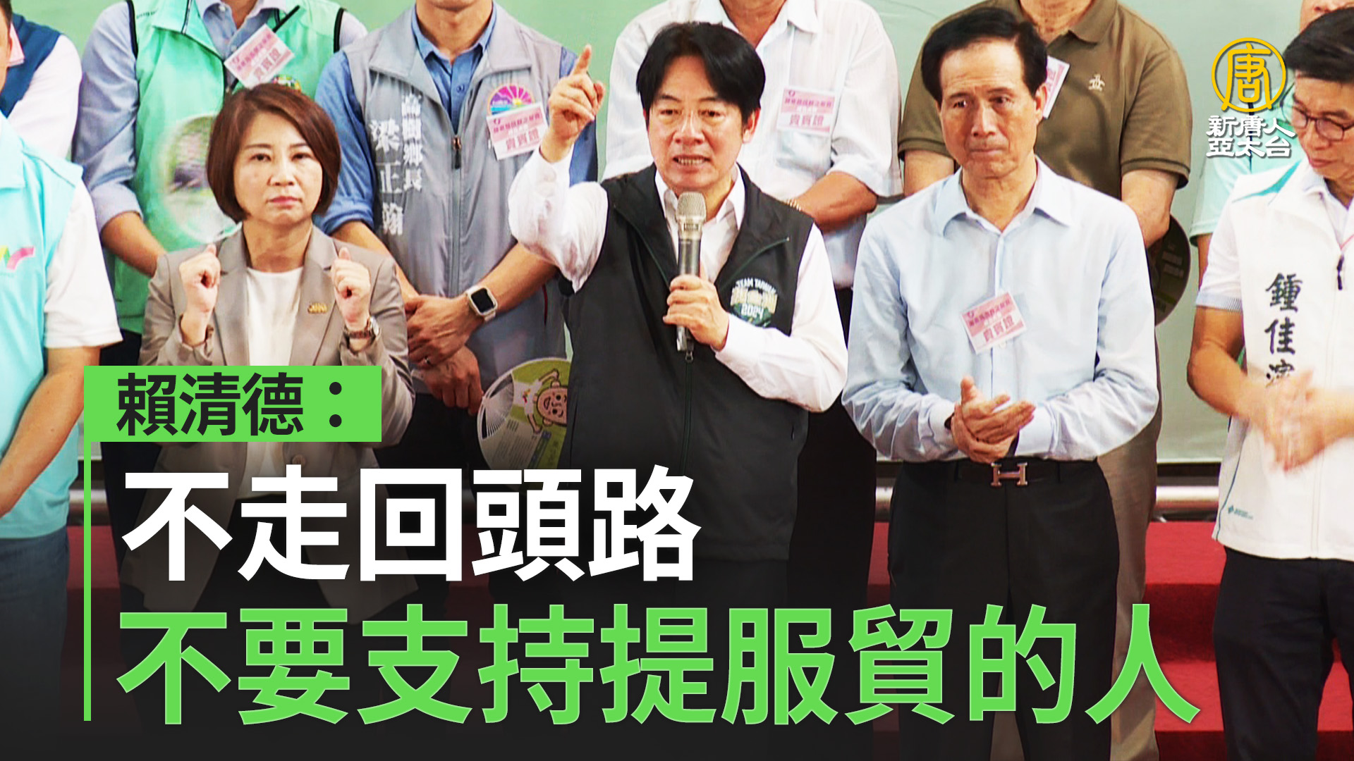 賴清德說,台灣經濟幾十年來轉型,要持續讓經濟走向國際,而不是走回頭路鎖進中國,呼籲支持者用選票拒絕服貿。
