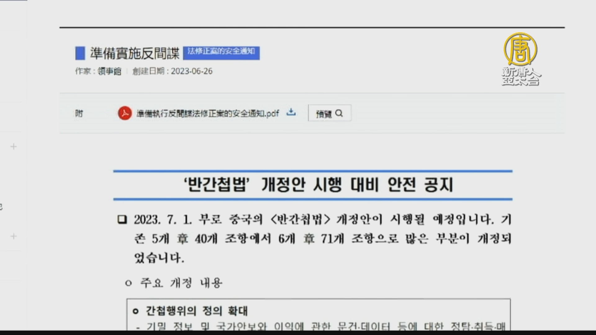 【新唐人亞太台 2023 年 07 月 01 日訊】中共7月1日新《反間諜法》上路,各國陸續對國民發出警告,韓國也表現出強烈的警惕。為防國民被誣陷為間諜,韓國從政府到輿論連連發出「要注意」的警告,韓國駐華大使館6月26日更在官網上發布公告,列舉了中共新的《反間諜法》大幅擴大間諜行為的範圍,表示新的《反間諜法》「與韓國在制度和概念等方面存在差異,可能會發生意想不到的損失」,有韓媒直接建議「非必要不要去中國」。