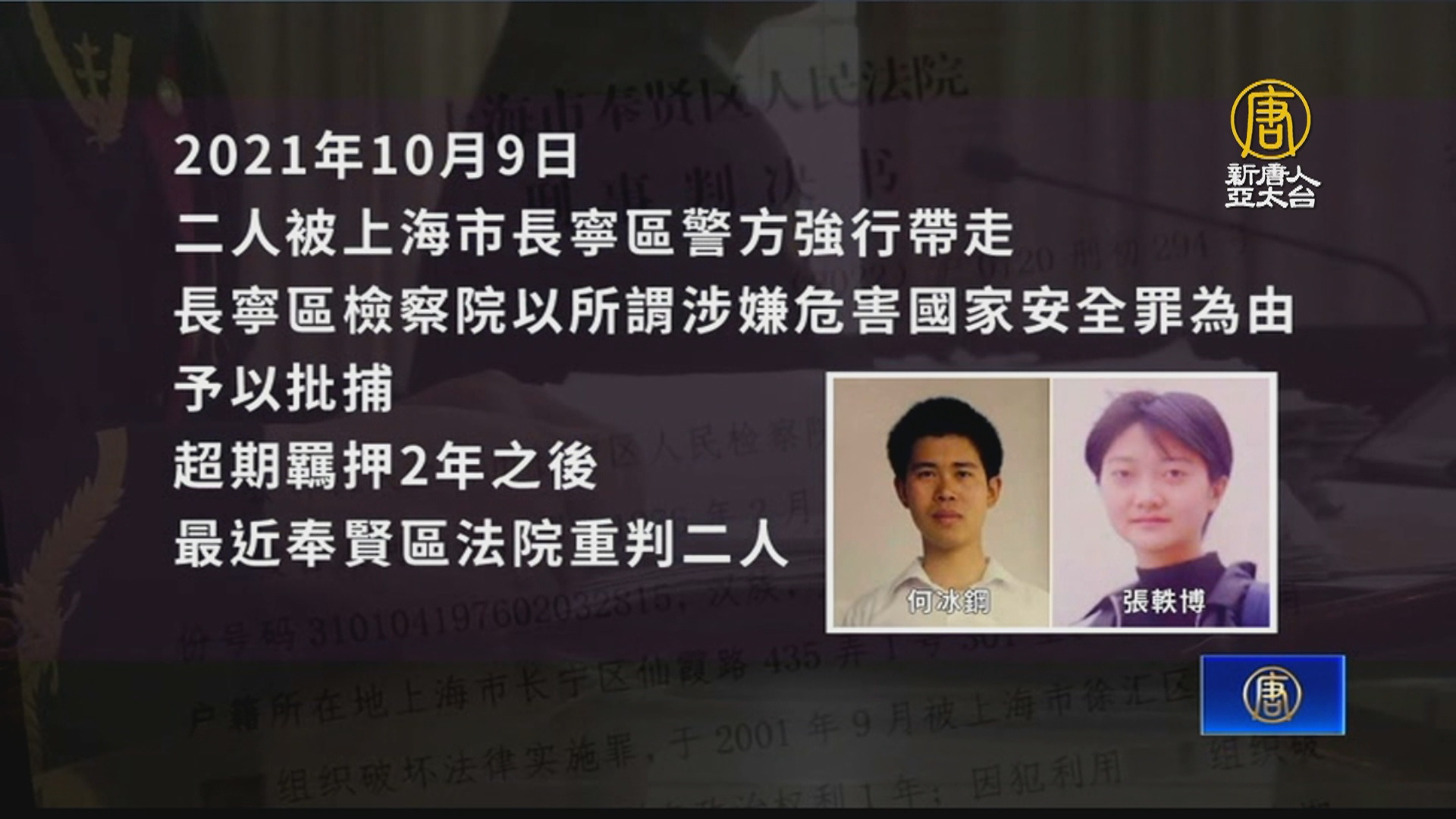 2021年10月9日,何冰鋼與回國探親的張軼博又被上海市長寧區警方強行帶走,長寧區檢察院以所謂的涉嫌危害國家安全罪由予以批捕。在超期羈押2年之後,最近奉賢區法院重判二人。
