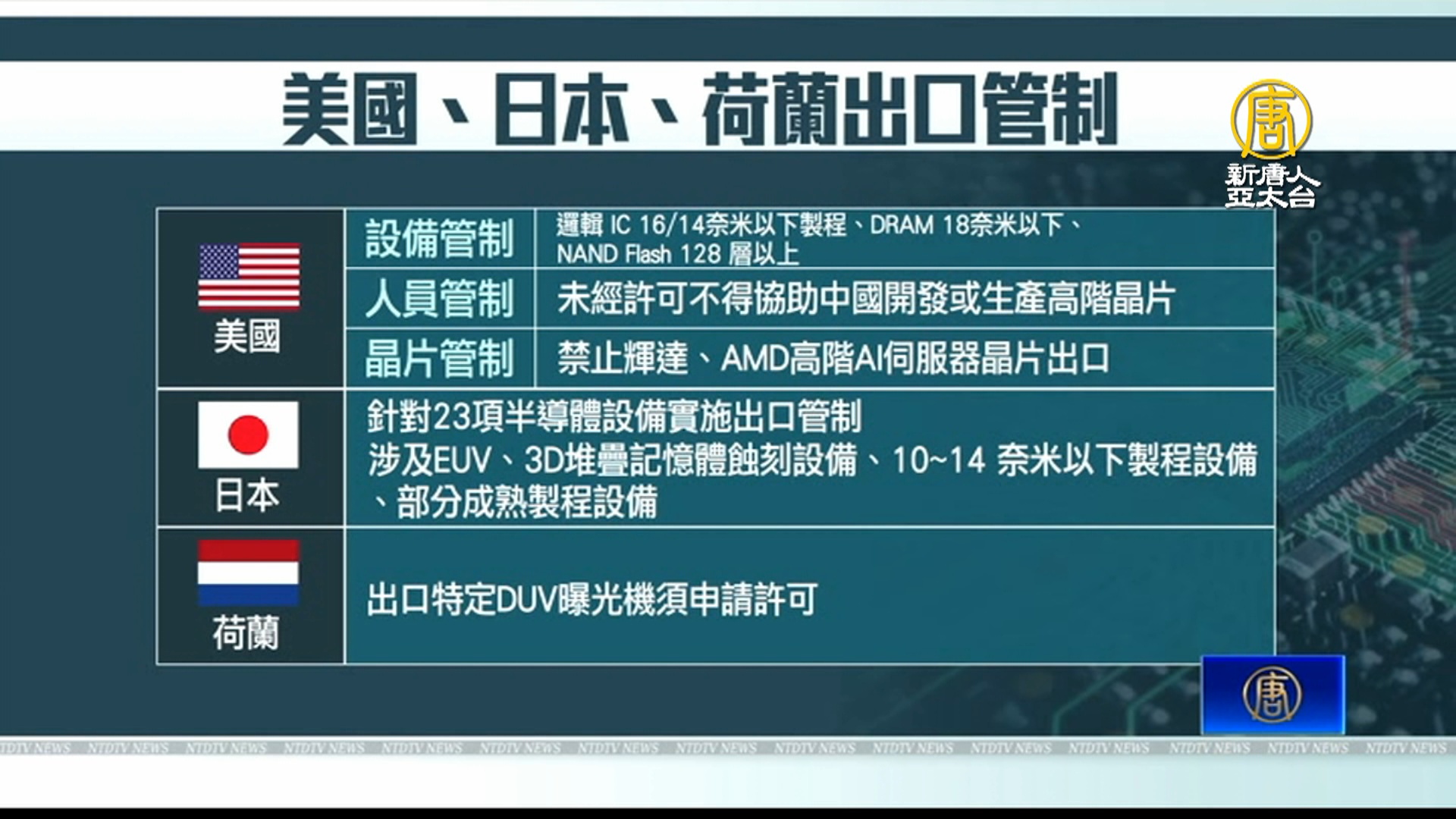 【新唐人亞太台 2023 年 07 月 04 日訊】美國從去年對中國大陸祭出,晶片出口管制,也極力說服盟友日本、荷蘭加入。美國從設備、晶片、人員進行全面管制,今年 5 月日本宣布跟進,針對23項半導體設備實施出口管制,範圍除了EUV相關製造設備之外,還涉及部分成熟製程設備。荷蘭也在 6 月底公布最新設備管制措施,出口特定DUV曝光機也需申請許可,三國對中半導體封殺網,已正式成形。
