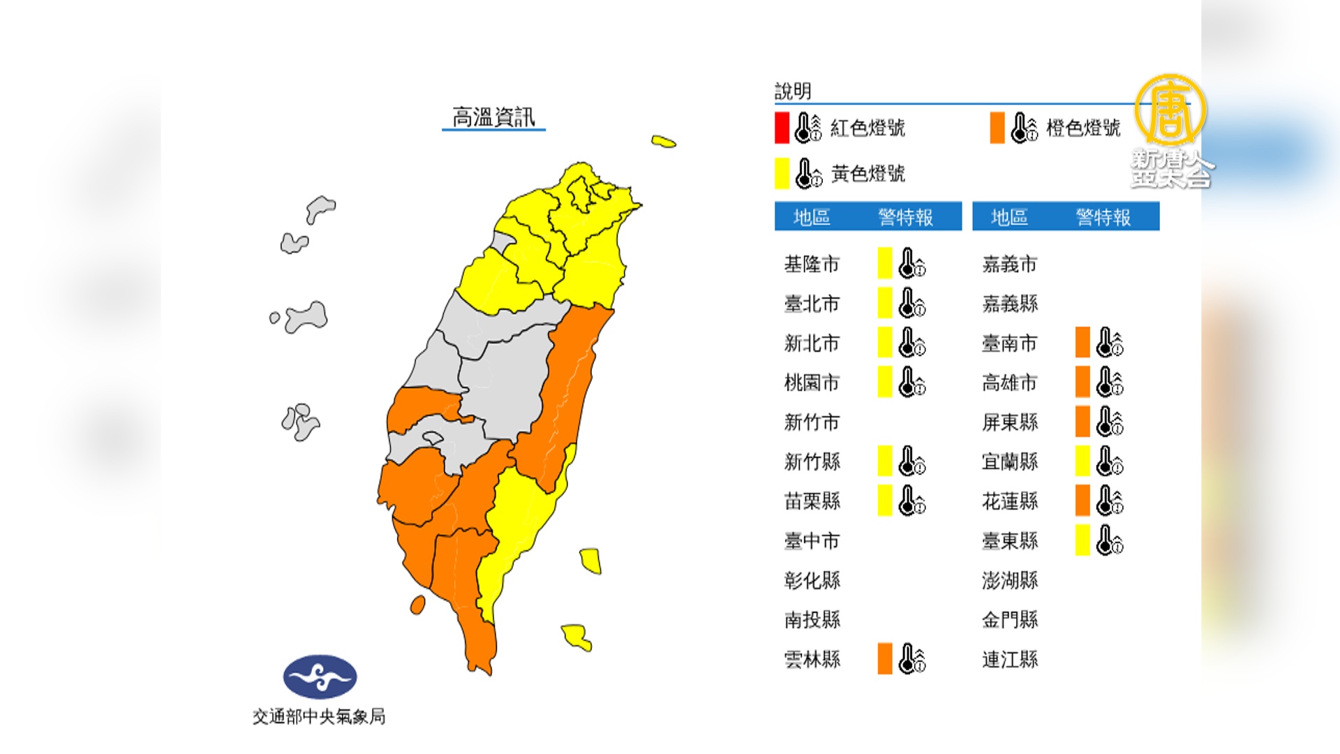 中央氣象局指出,受西南風影響,台東地區有焚風發生的機率,今(5)日白天花蓮地區為橙色燈號,有38度極端高溫出現的機率;雲林、台南、高雄、屏東為橙色燈號,有連續出現36度高溫的機率,請加強注意。基隆、台北、新北、桃園、新竹、苗粟、宜蘭、台東為黃色燈號,請注意。