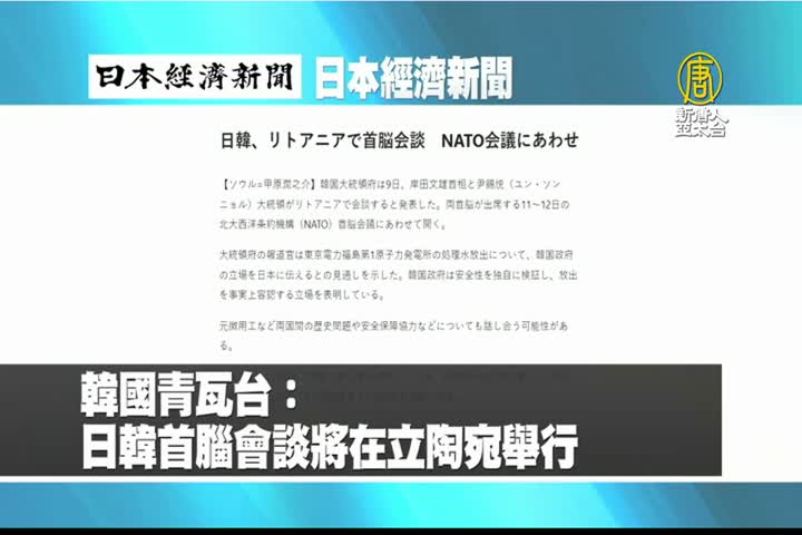 【新唐人亞太台 2023 年 07 月 10 日訊】來看到日本經濟新聞報導:北約峰會即將在立陶宛召開,日韓兩國領袖將同時出席。韓國青瓦台宣布,日韓首腦會談也將藉此機會在立陶宛舉行。
