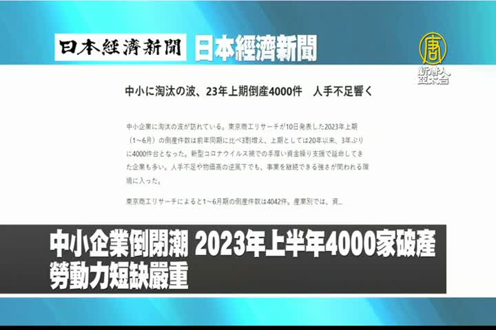 【新唐人亞太台 2023 年 07 月 11 日訊】來看到日本經濟新聞報導:日本中小企業倒閉潮,2023年上半年已有4000家破產,勞動力短缺嚴重。