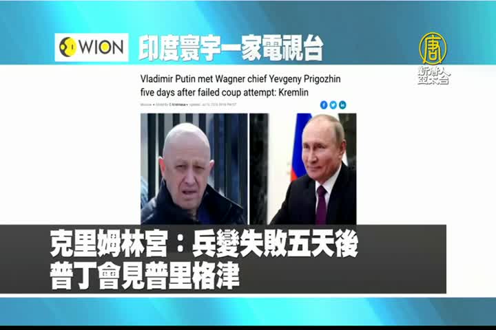 【新唐人亞太台 2023 年 07 月 11 日訊】最後是印度寰宇一家電視台報導:克里姆林宮表示,兵變失敗五天後,俄羅斯總統普丁,會見了瓦格納集團首腦普里格津。