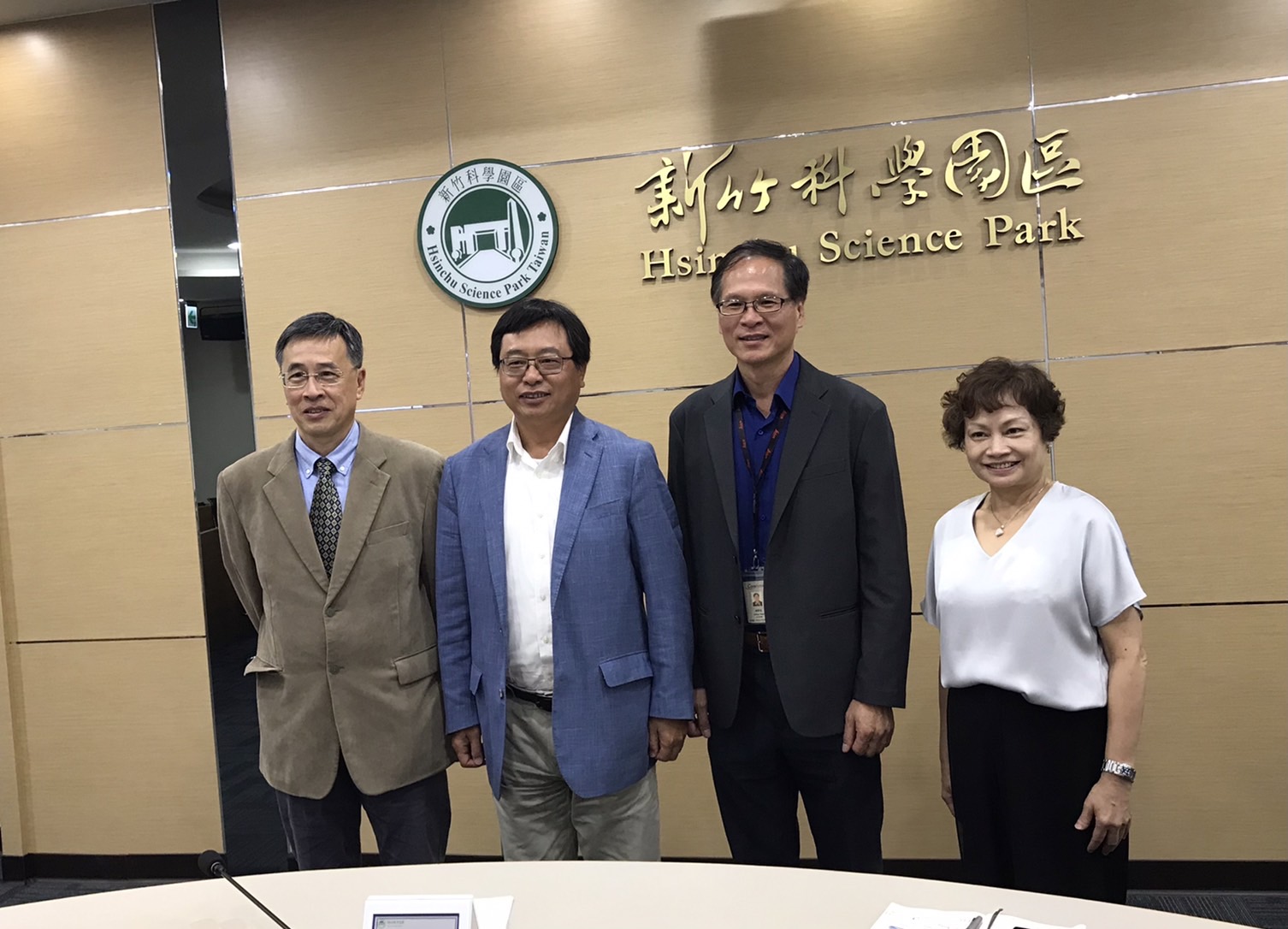 雷射科技公司總經理邱建嘉、竹科管理局長王永壯、智能機器人公司總經理謝啟堂、副局長陳淑珠合影。 (新唐人新竹辦事處 熊健媄提供)