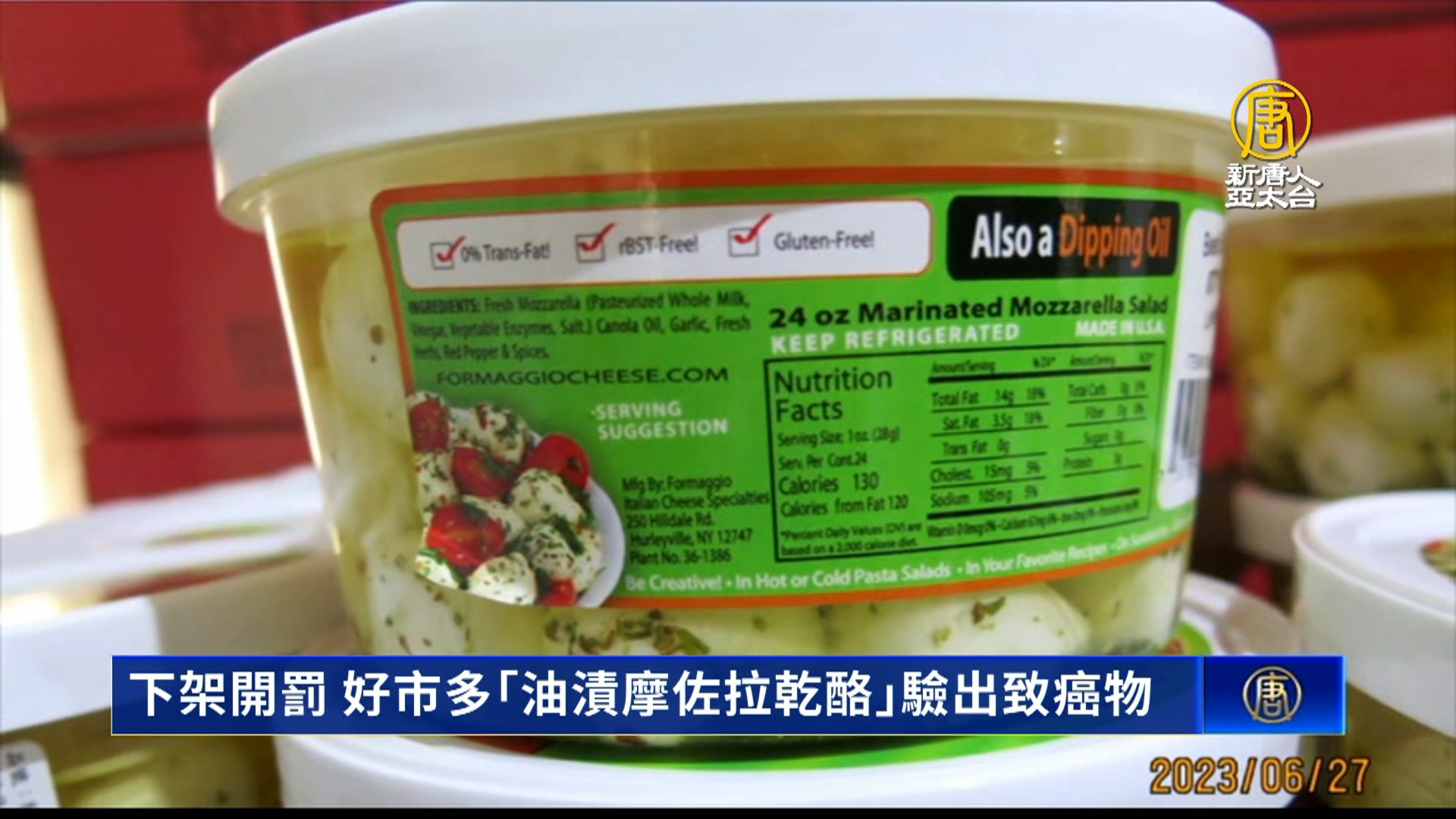 【新唐人亞太台 2023 年 07 月 12 日訊】台灣的好市多賣場,繼先前發生莓果風波後,又傳出問題產品「油漬摩佐拉乾酪」被驗出「環氧乙烷」,民眾若吃下肚,會增加罹癌風險。業者火速召回問題商品。台灣政府食藥署表示,要求商品下架,也將依違反《食安法》,處以新台幣6萬以上、2億元以下罰鍰。