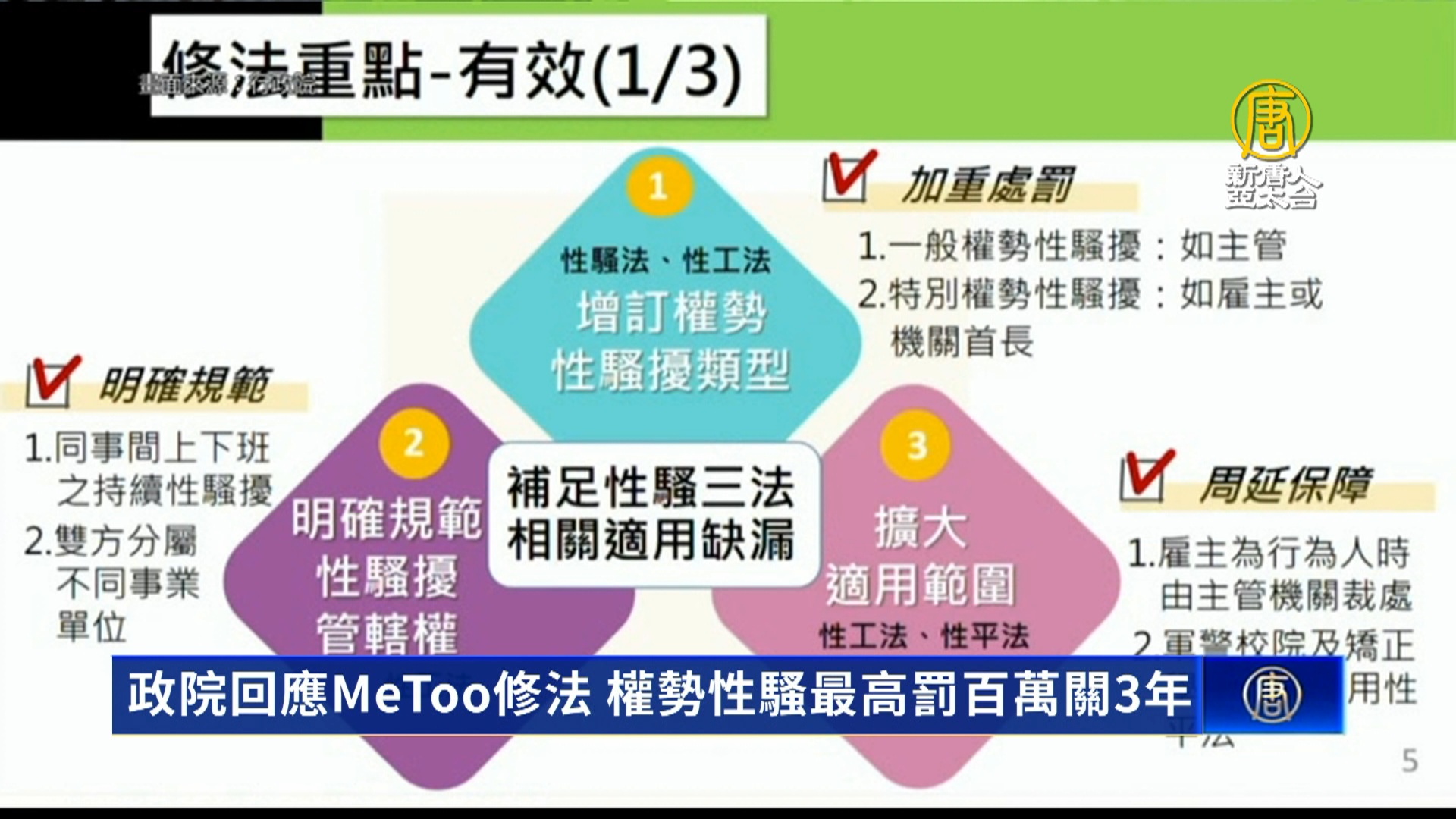 【新唐人亞太台 2023 年 07 月 13 日訊】台灣延燒一個月、範圍擴及多個領域的MeToo性騷擾風波,今天(13日)有了新進度。行政院會通過修正草案,針對權勢性騷擾加重處罰,民事新增懲罰性賠償,最高加重5倍,行政罰最高可罰100萬元,而在刑事部分,權勢性騷者將加重其刑二分之一,最高判刑3年。