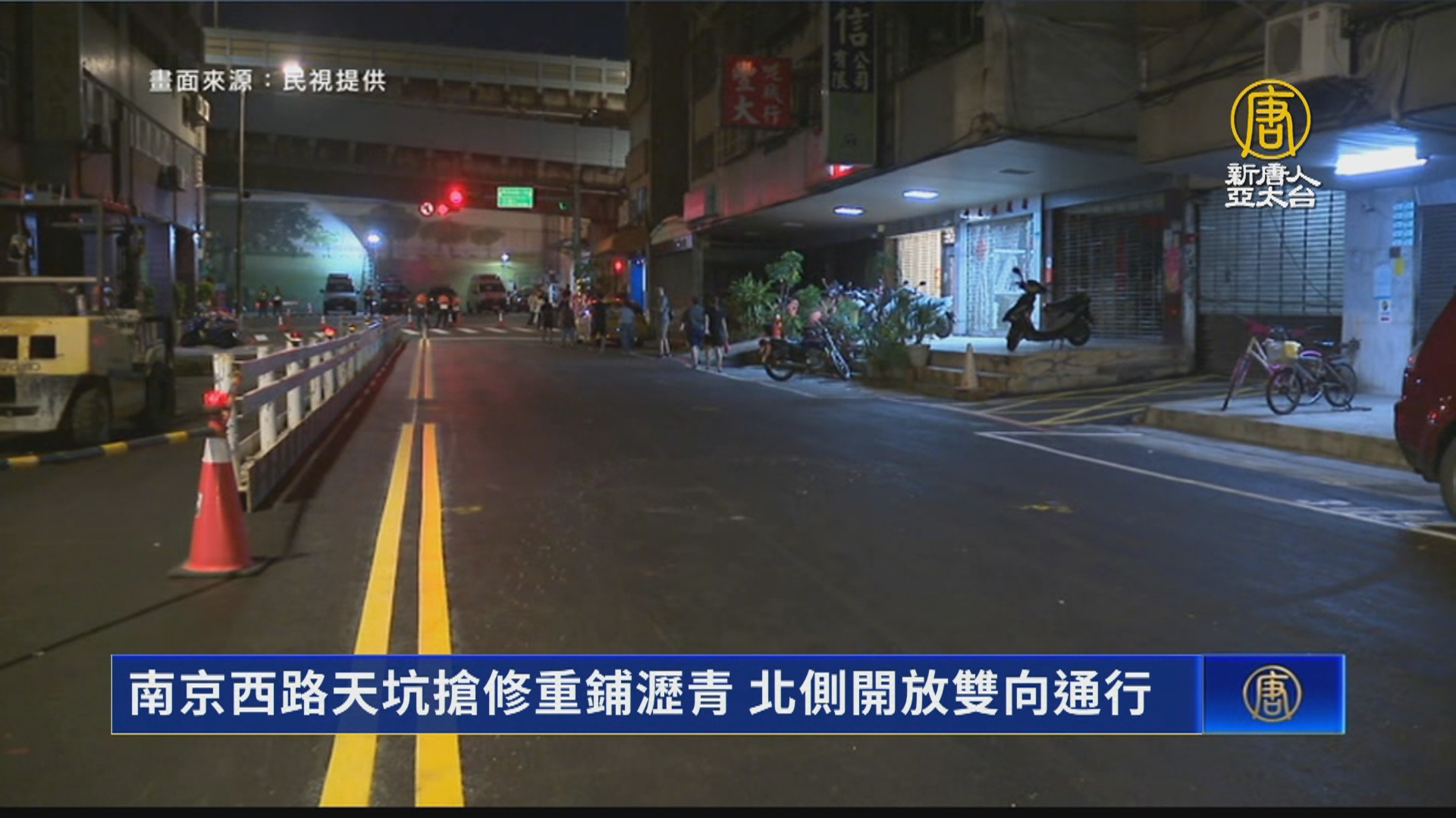 【新唐人亞太台 2023 年 07 月 13 日訊】歡迎回來,台北市南京西路,日前出現大面積坍塌,原因是汙水管漏水導致,市府緊急封閉雙向車道,工務單位也持續搶修,昨天(12號)下午鋪設瀝青後,進行透地雷達偵測,晚間11點開放北側車道雙向通行,3天後施工完畢,再對調修理,可望一週內就能雙側都通車。