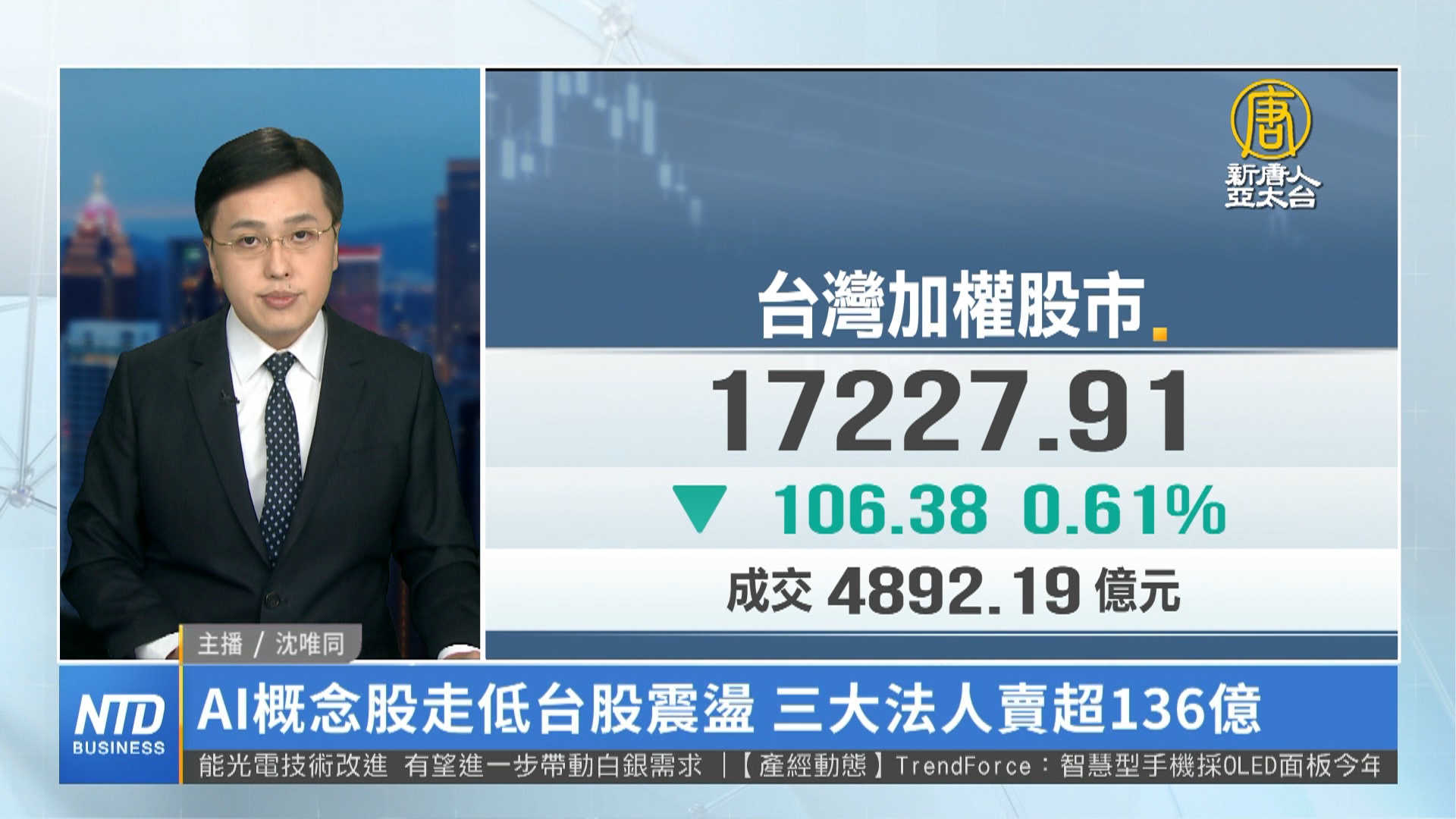 【新唐人亞太台 2023 年 07 月 18 日訊】新聞一開始帶您看到金融市場,美股周一在特斯拉、英特爾、輝達和 AMD漲勢帶動之下,費半指數大漲超過2%,道瓊連續六天收紅。不過台股部分,早盤在AMD執行長蘇姿丰來台,人工智慧(AI)題材持續發酵下,指數一度越過17400點,但隨後翻黑下跌,高低震盪236點。AI概念股表現分岐,廣達上漲2.81%,不過緯創則是下跌4.66%,台積電也下跌10元至581元,宏碁宣布打入AMD顯卡市場,股價衝上11年來新高,大漲7.47%。值得注意的是,不好分析師示警AI概念股有過熱疑慮,台股雖然創下2年來最大成交量4800億,但三大法人獲利了結,賣超136.58億元。