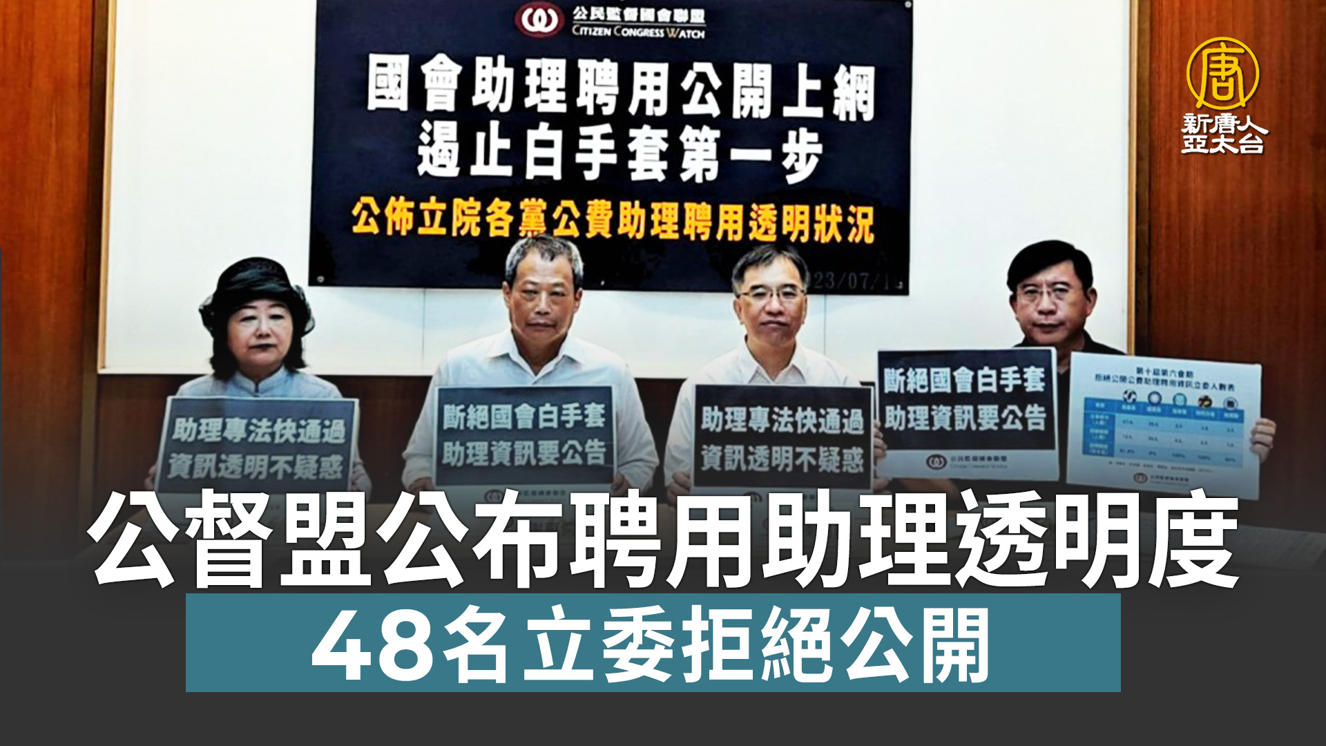 【新唐人亞太台 2023 年 07 月 19 日訊】公民監督國會聯盟,近期訴求遏止國會立法院可能的白手套問題,今天(7月19日)召開記者會,公布上一會期立委公費助理聘用狀況的透明度,全立法院有48位立委拒絕揭露公費助理的基本資訊。「公督盟」呼籲選民檢視、用選票抵制黑箱政黨與立委。