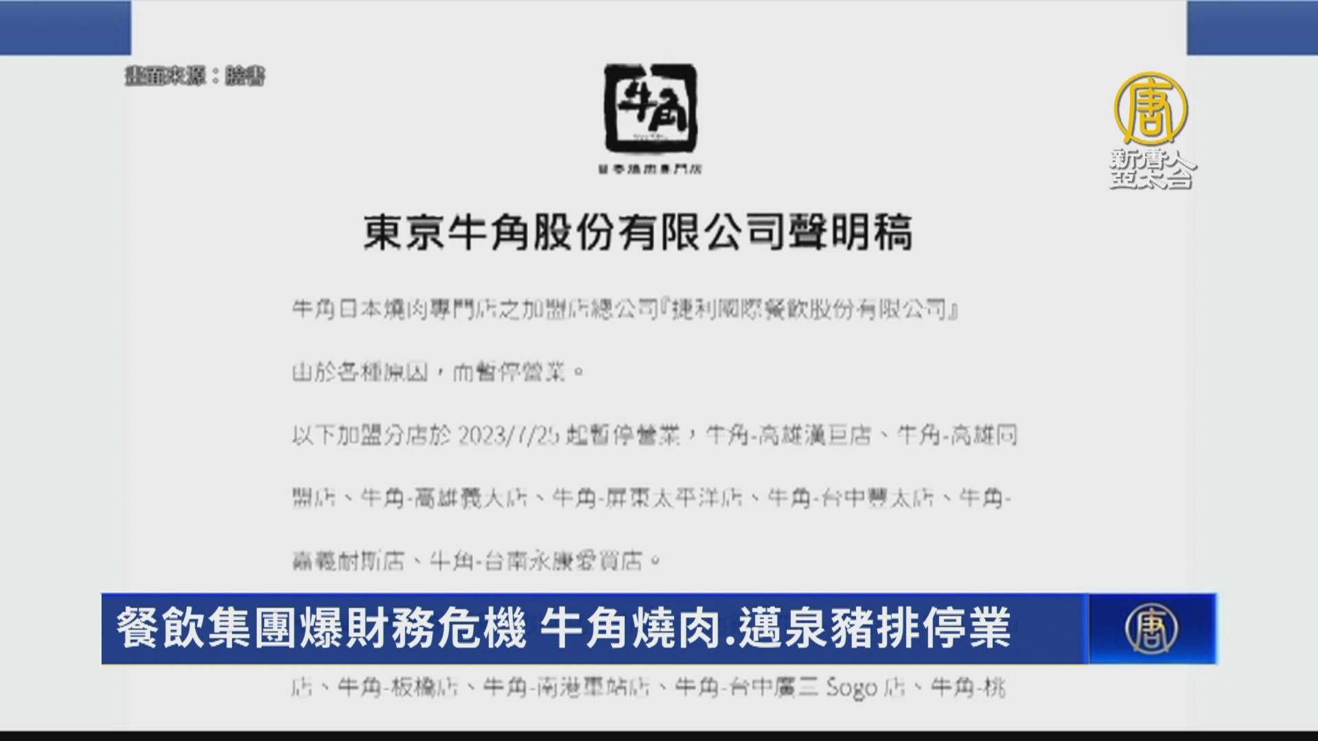 【新唐人亞太台 2023 年 07 月 25 日訊】旗下擁有牛角燒肉專賣店、邁泉豬排等知名品牌的「捷利國際餐飲集團」,今(25)天驚傳出現資金周轉問題,由於母公司「五互集團」捲入不法吸金案,導致營運出現危機,旗下包括「牛角燒肉」、「邁泉豬排」等30家店鋪,都將無預警歇業。勞動部表示公司員工人數約500人,7月份薪資可能無法支付,已要求分店涉及的6縣市政府查訪。