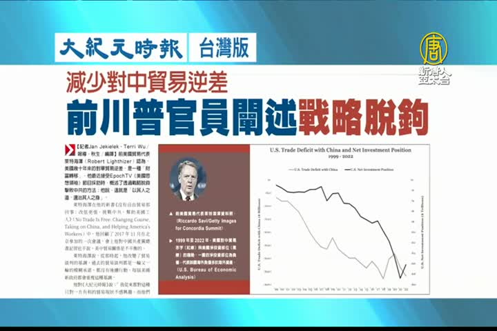 【新唐人亞太台 2023 年 07 月 26 日訊】接著看到大紀元時報台灣版報導:減少對中貿易逆差,前川普官員闡述戰略脫鉤。