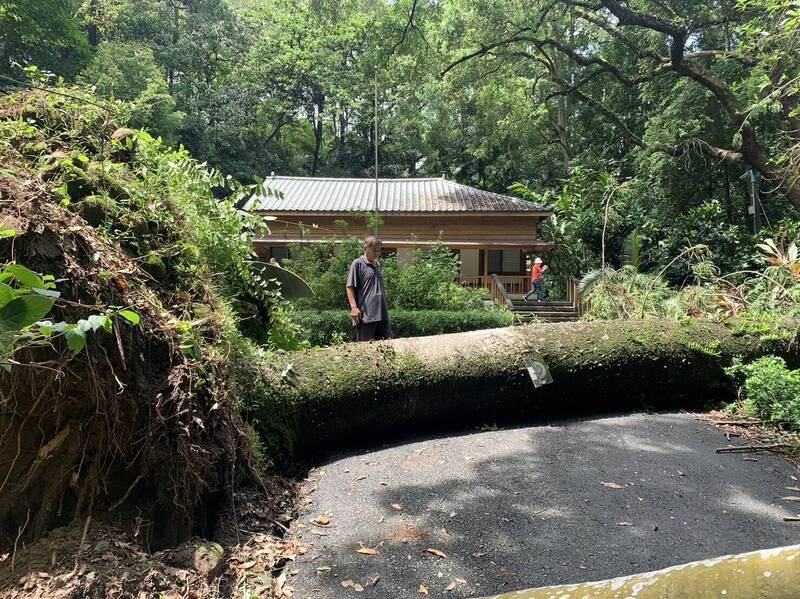 中埔研究中心表示,位在樹木園管理室前階梯旁的這棵「肯氏南洋杉」,高28.32公尺,1920年從澳洲引進來的2棵母株之一,距今逾100年。原有2棵老樹肯氏南洋杉併排,2016年蘇迪勒颱風挾帶強風豪雨,造成其中1棵肯氏南洋杉倒伏;中埔研究中心在樹幹上掛角度傾斜儀,監測6年至今只微傾斜12度,形成樹木園特殊景觀。23日晚間突倒伏,中埔研究中心決定休園,並巡檢園區樹木安全。