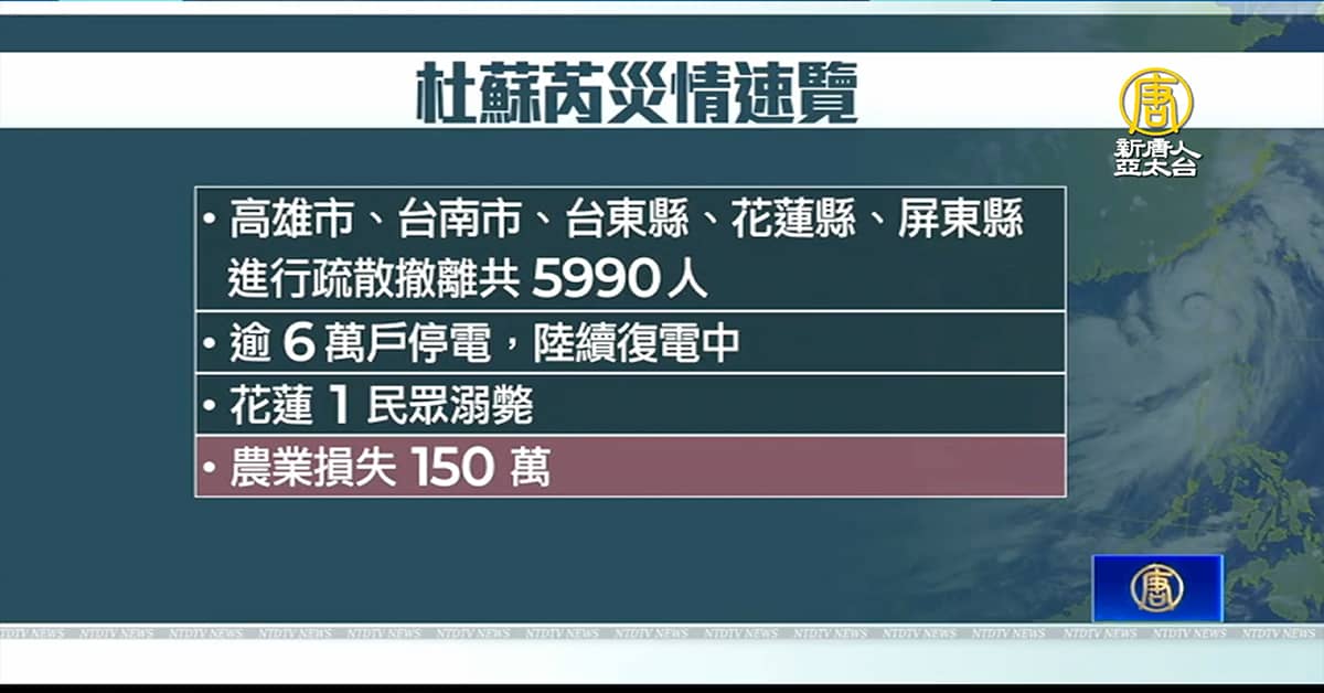 【新唐人亞太台 2023 年 07 月 28 日訊】杜蘇芮颱風帶來的致災性強風大雨,目前已經造成全台五縣市疏散將近6千人,並且有超過6萬戶停電。此外,還造成1位民眾死亡,以及零星的民眾受傷。目前的農業經濟損失,也達到150萬元。目前東半部已累積「致災性」大量降雨,提醒民眾週末避免山區活動。