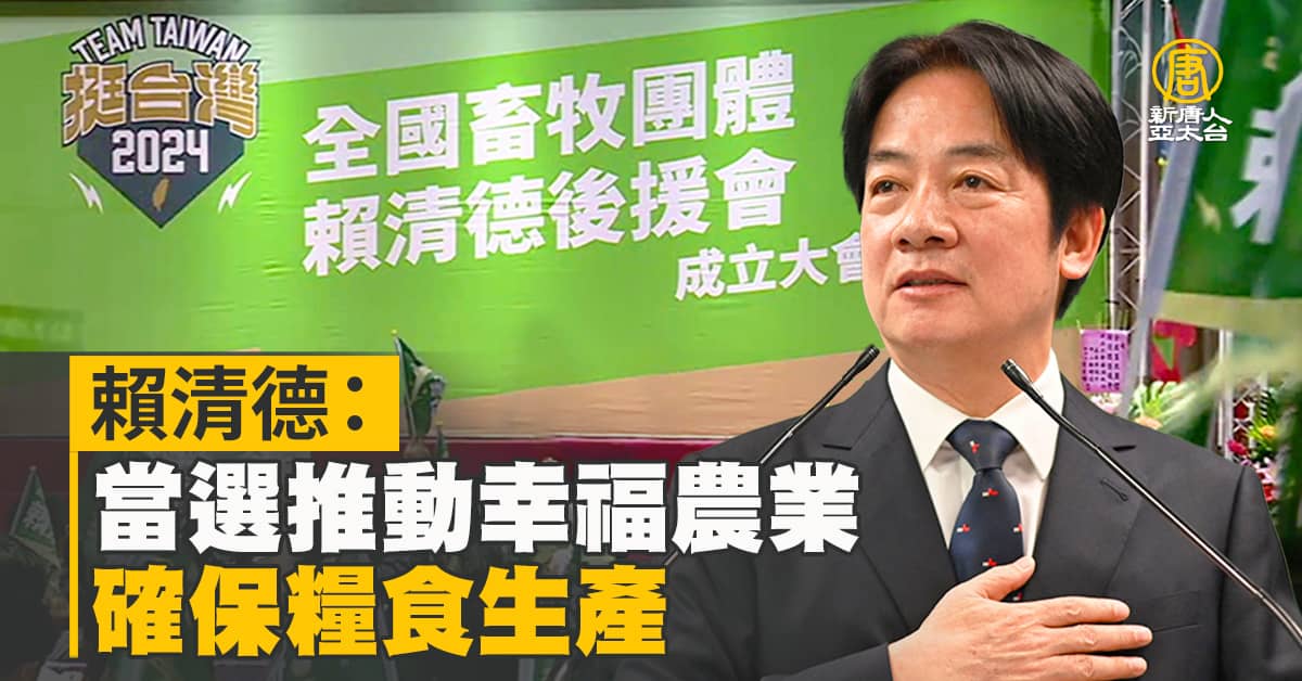 民進黨總統參選人 賴清德:「你看烏克蘭、你看美國,他們都是全世界的糧倉,但是氣候變遷之後,他們的生產受到戰爭影響,都大大減少,所以在這種情況下,我們農業、畜牧業,有一個基本的使命,就是供應台灣2350萬人的糧食無虞。」