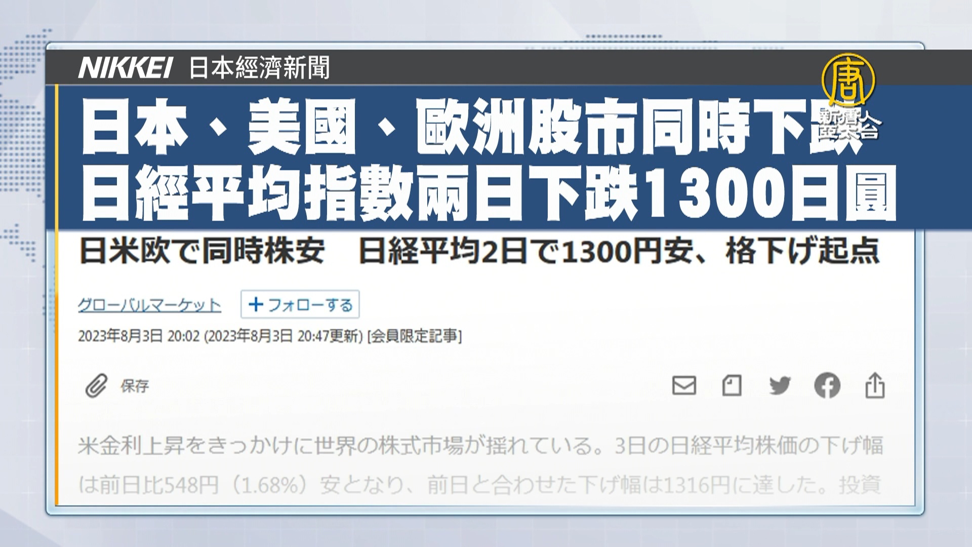來看到日本經濟新聞報導:日本、美國、歐洲股市同時下跌,日經平均指數兩日下跌1300日圓。