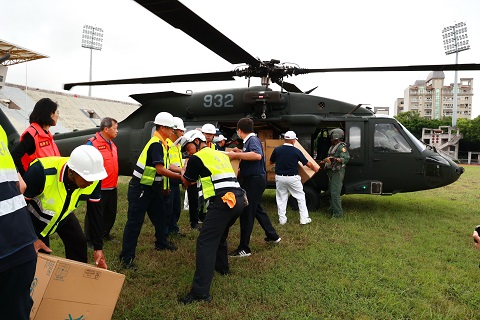 今天上午自清泉崗及嘉義機場,共6架次直升機飛至位於南投市的南投縣體育場,載運空投物資協助空投仁愛鄉的急用物資,包括,飲用水、罐頭、泡麵、嬰兒奶粉、成人尿布、嬰兒尿布及睡袋等,數量從上百箱到數十箱不等。接受空投(部分飛入仁愛鄉,再陸路分送)的有發祥村、春陽村、精英村、大同村、親愛村、都達村及南豐村等7村,其中發祥村的全部及精英村部分物資約300公斤由縣府開口契約廠商提供,其餘南豐村等6村物資約1,700公斤均由慈濟慈善基金會捐贈。