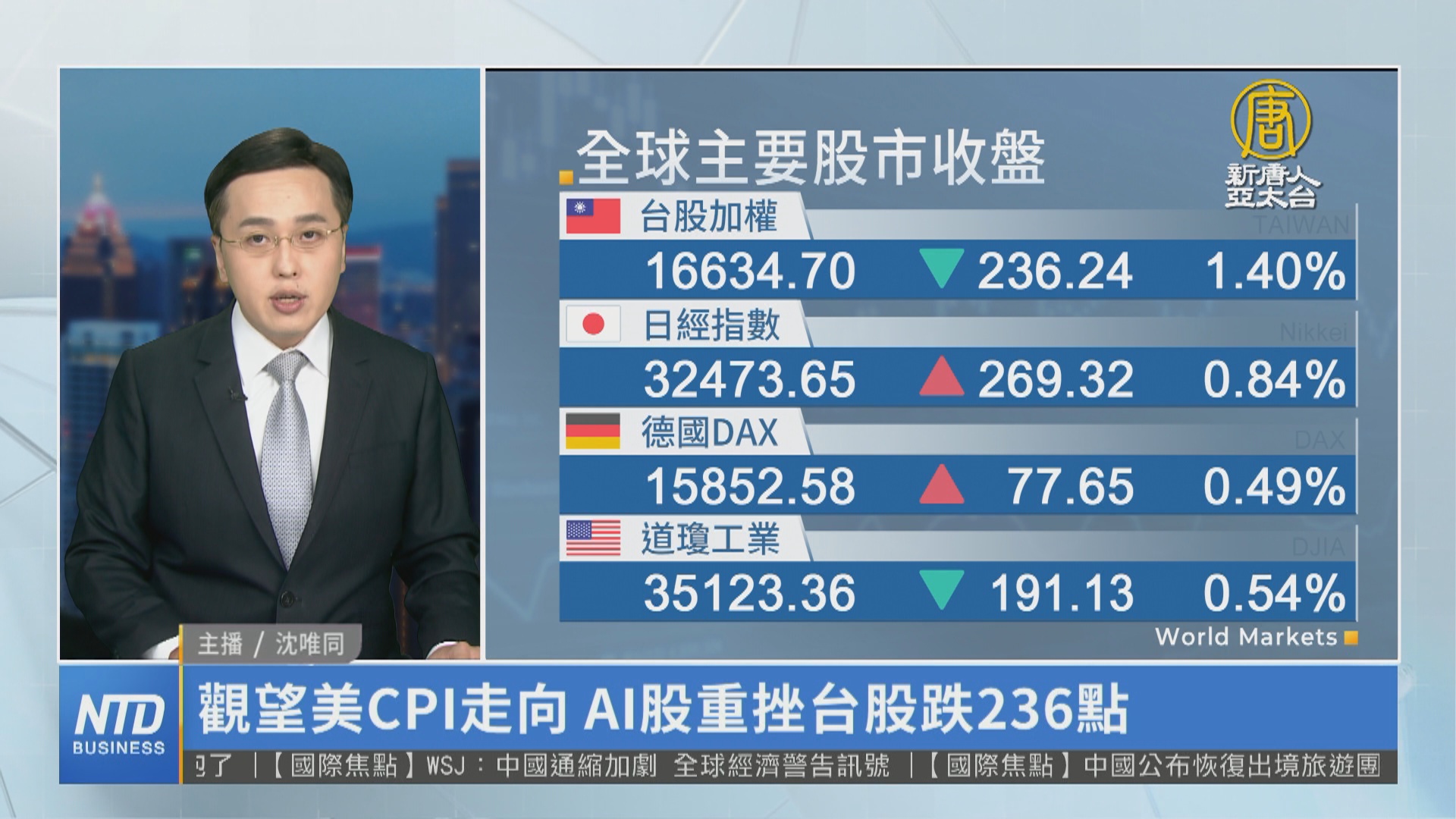 【新唐人亞太台 2023 年 08 月 10 日訊】新聞一開始帶您關心國際股市,華爾街投資人,等待即將出爐的美國7月消費物價指數(CPI),美股主指週三(9日)下跌,道瓊下滑190點,費城半導體指數重挫超1.8%,輝達下跌4.7%,衝擊AI概念股表現,台股週四摜破季線,下跌236.24點,收在16634.7點,分析師指出,短線主流AI族群,近期面臨較大修正壓力,如果指數續跌,可能鬆動多頭信心。