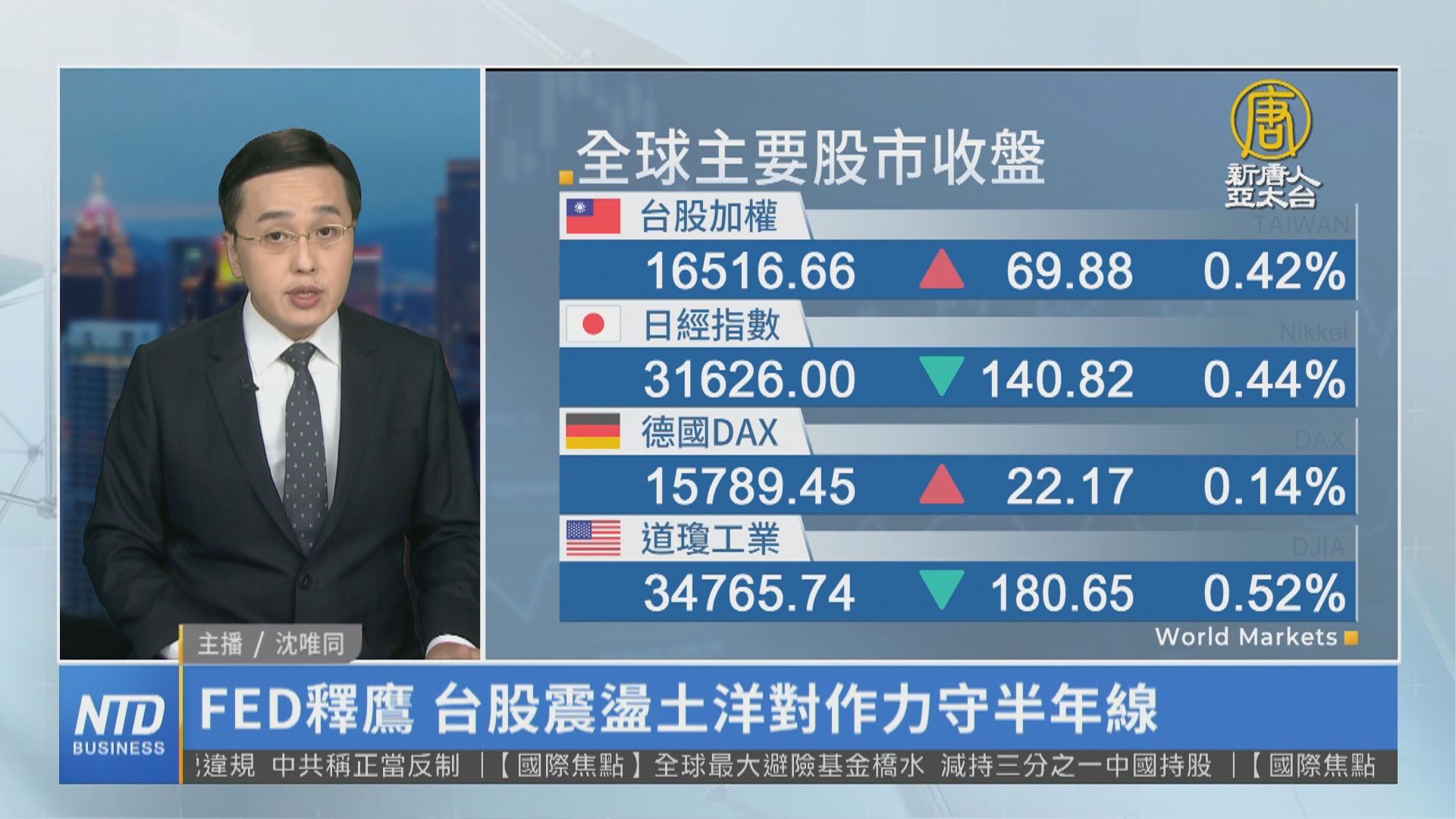 【新唐人亞太台 2023 年 08 月 17 日訊】新聞一開始帶您關心,美國聯準會,公布七月底會議的紀要,內容指出通膨有持續升高風險,可能需要進一步地緊縮貨幣政策,消息公布之後,美債殖利率持續走高,10年期公債來到4.2504%,30年期公債達4.3519%,債券市場出現重挫,美國主要指數全面下跌。利空衝擊之下,台股今天回測半年線,外資大舉賣超,但內資買盤力撐,土洋對作,指數上下震盪近三百點,AI族群上揚、金融跌幅收斂,大盤終場上揚69.88點,收在16516.66點,守住半年線大關。