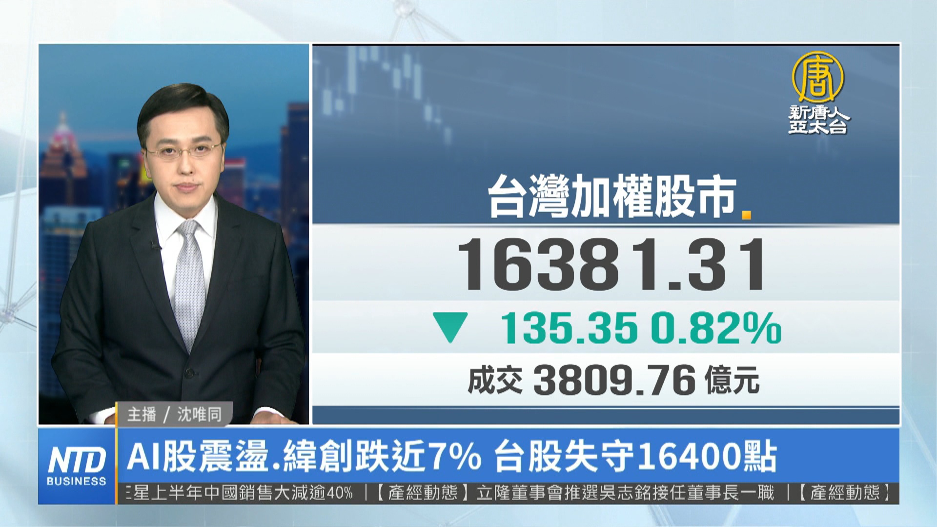 【新唐人亞太台 2023 年 08 月 18 日訊】新聞一開始帶您關心金融市場,美國長天期公債殖利率,延續近期漲勢,連續6個交易日走揚,10年期及30年期公債殖利率觸及2007年、2011年來高點,17日美國債市、股市同步走低,台股今(18)日午盤過後市場震盪,指數失守16400點關卡,AI股概念股,指標之一的緯創一度觸及跌停,下跌6.59%,廣達下挫6.06%,市場以航運股、金融股撐盤,加權指數終場下跌135.35點,三大法人合計賣超242億。