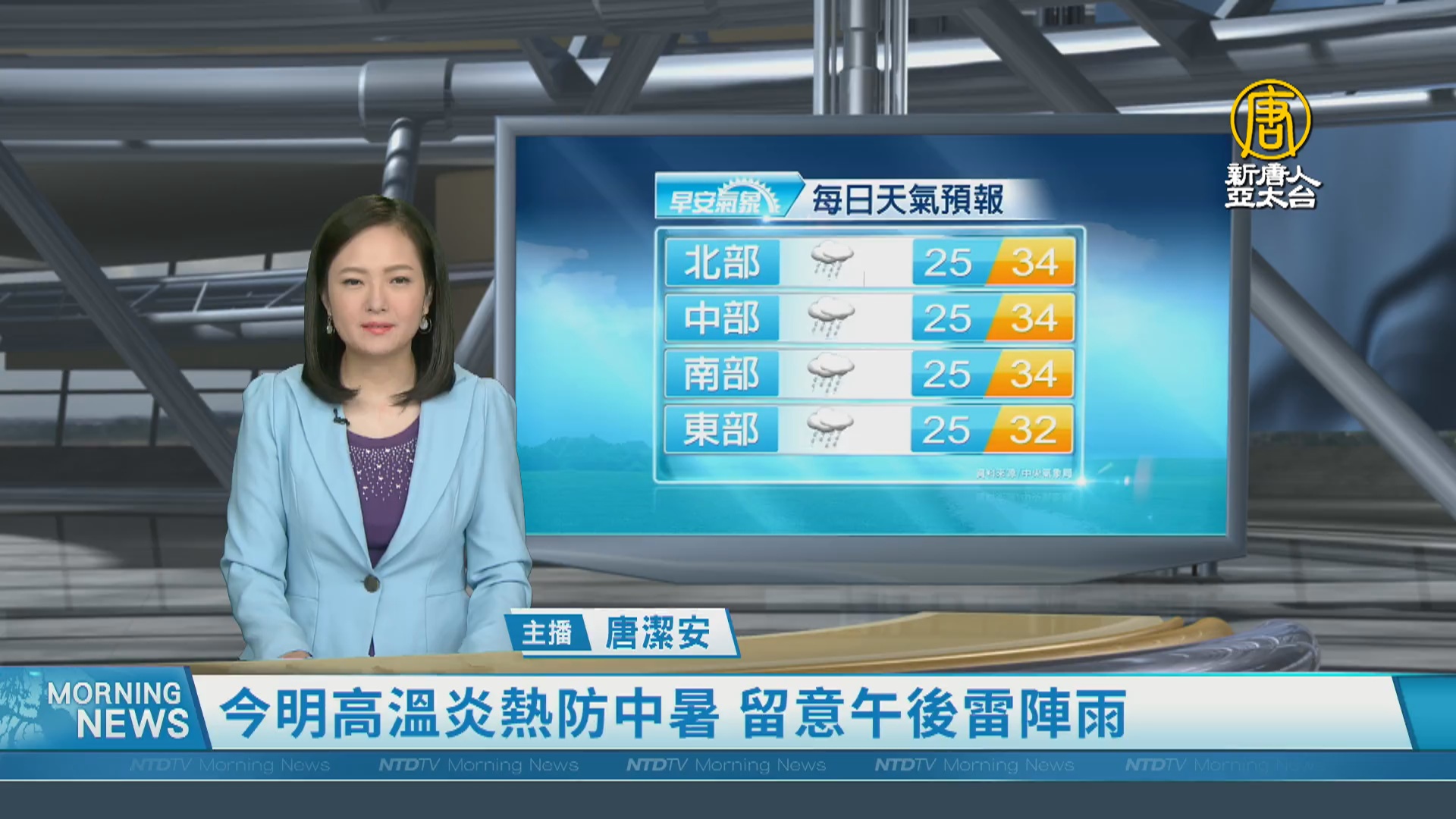 【新唐人亞太台 2023 年 08 月 22 日訊】歡迎您收看8月22日的早安新唐人,我是唐潔安,先來帶您關心天氣。今明兩天,台灣各地為多雲到晴,提醒觀眾朋友出門多補充水分、防中暑。另外,仍要留意午後有局部短暫雷陣雨。帶您一起來看到國際媒體重要訊息。