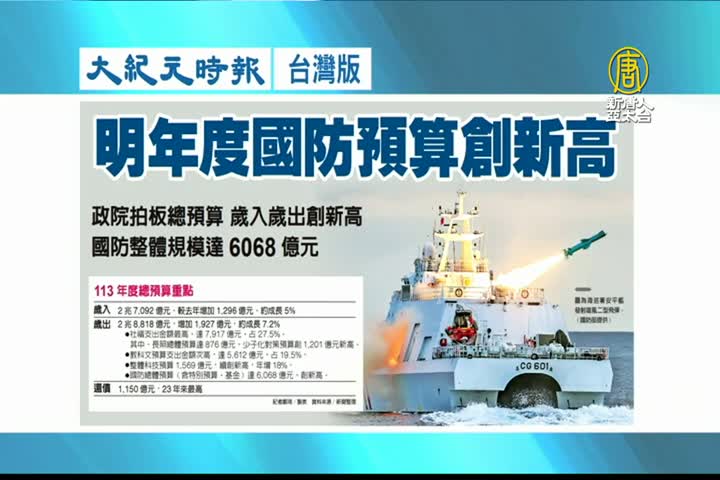 【新唐人亞太台 2023 年 08 月 25 日訊】接著看到大紀元時報台灣版報導:明年度國防預算創新高,政院拍板六千零六十八億元。