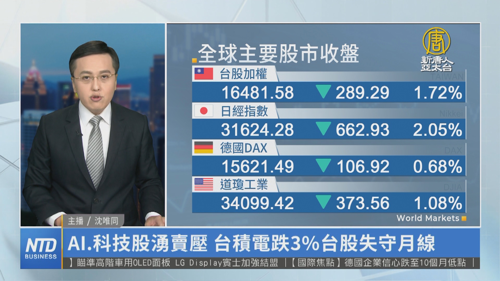 【新唐人亞太台 2023 年 08 月 25 日訊】美聯準會(Fed)主席鮑爾發表談話在即,但金融市場卻是震盪加劇,儘管輝達發表亮眼財報,但美股週四主要指數收黑,道瓊下挫373點,將前一天漲幅全數吐回,科技股出現沉重賣壓,也拖累台股今天表現,台灣大型電子權值股疲弱,台積電跌幅超過3%,鴻海與聯電下跌超過1%,終場台股收在16481點,三大法人賣超413億,外資明顯佔在空方,8月至今賣超1268億。