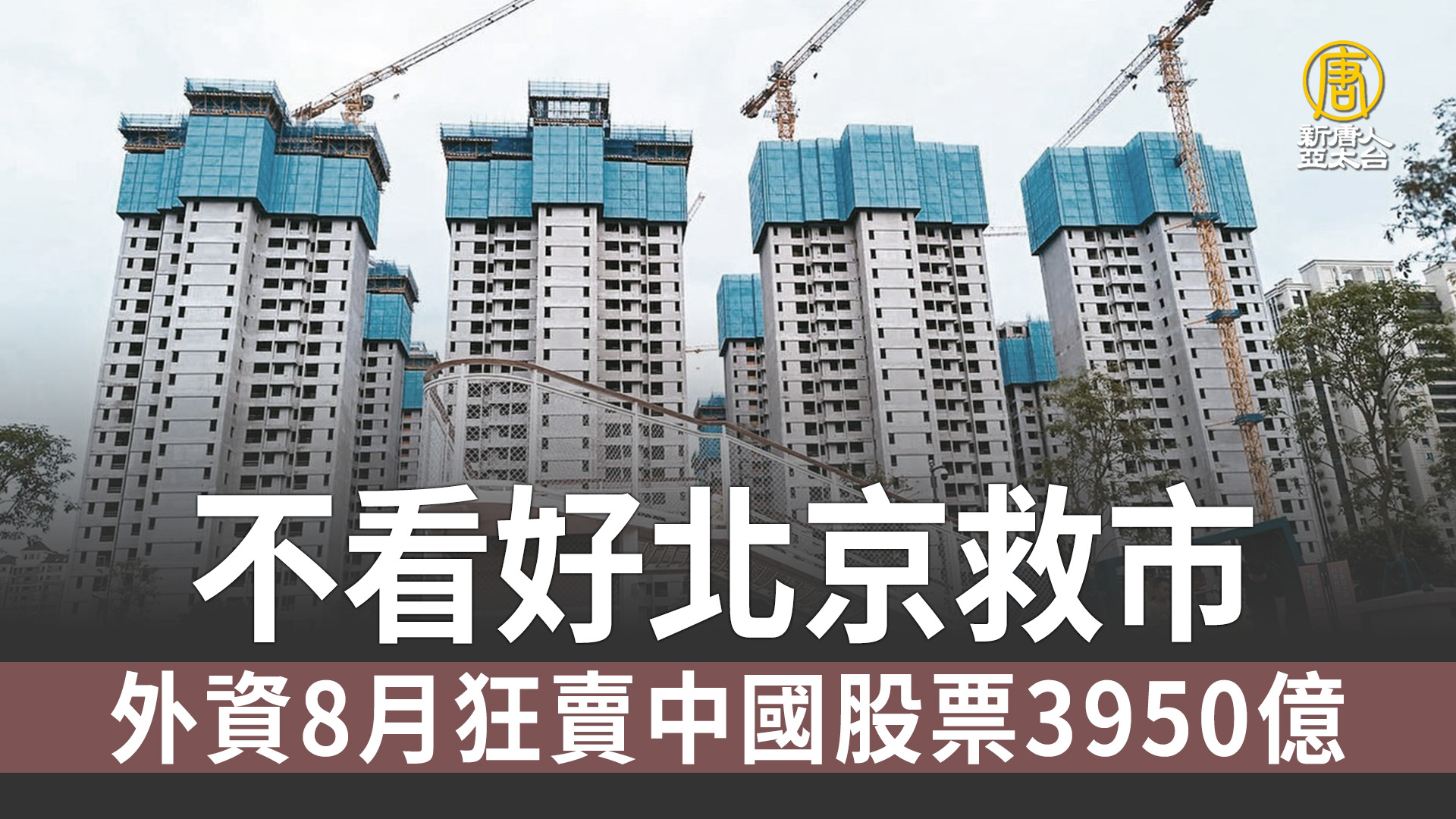中國經濟惡化,北京當局採取的支持措施過於零碎,無法化解外界疑慮,加上中國房地產業債務危機持續惡化,外國投資人8月拋售高達124億美元,約3950億台幣的中國股票。