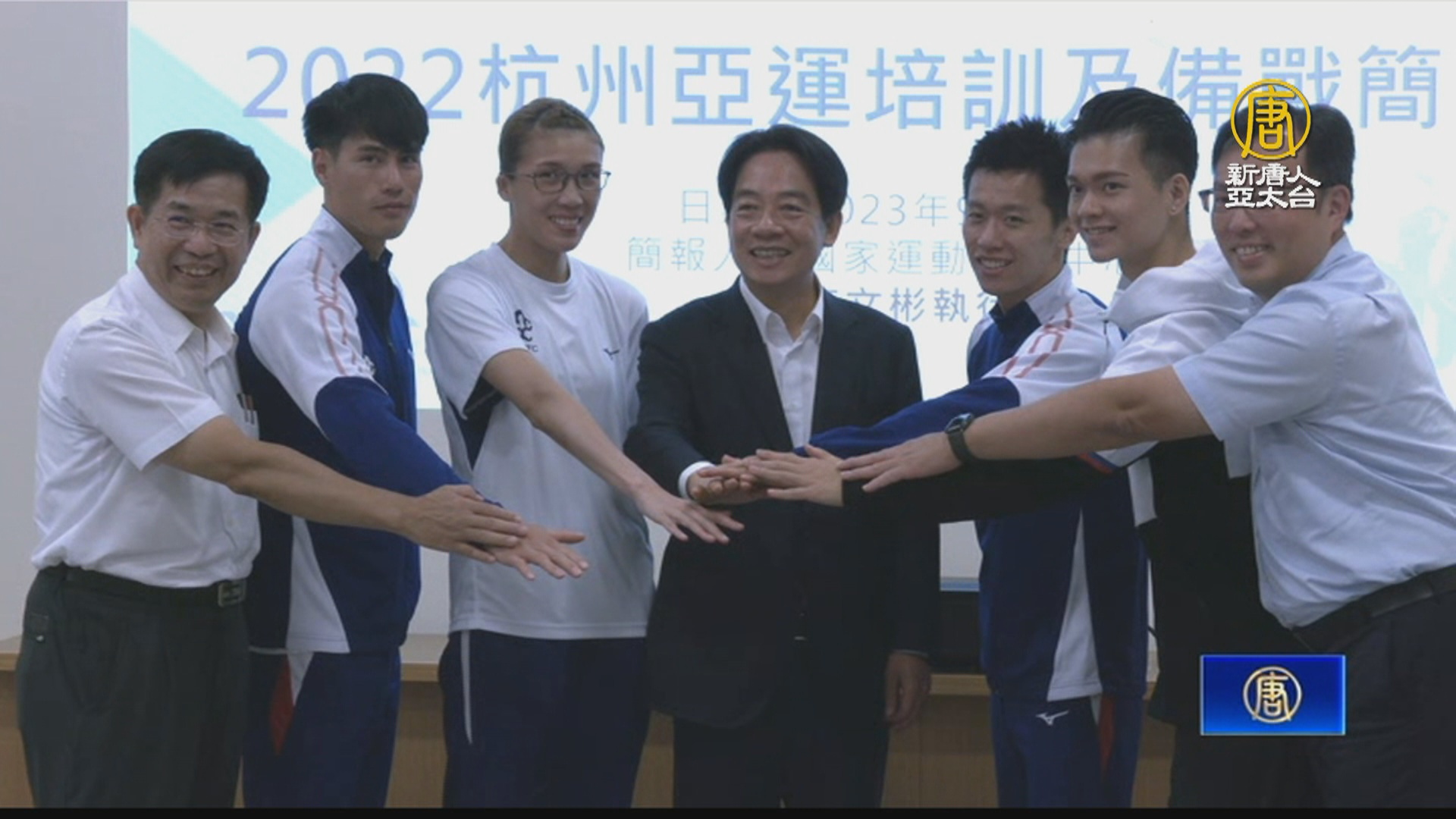 【新唐人亞太台 2023 年 09 月 05 日訊】副總統賴清德今天(5日)特別到國家運動訓練中心,了解選手杭州亞運的備戰情形,並致贈加菜金與選手加油勉勵,他說,政府有責任讓每位選手都能在國際賽場上追逐夢想,運動選手在國際舞台比賽時,也就是國家力量凝聚最大的時候,大家不分族群、黨派、地域,都團結在一起。