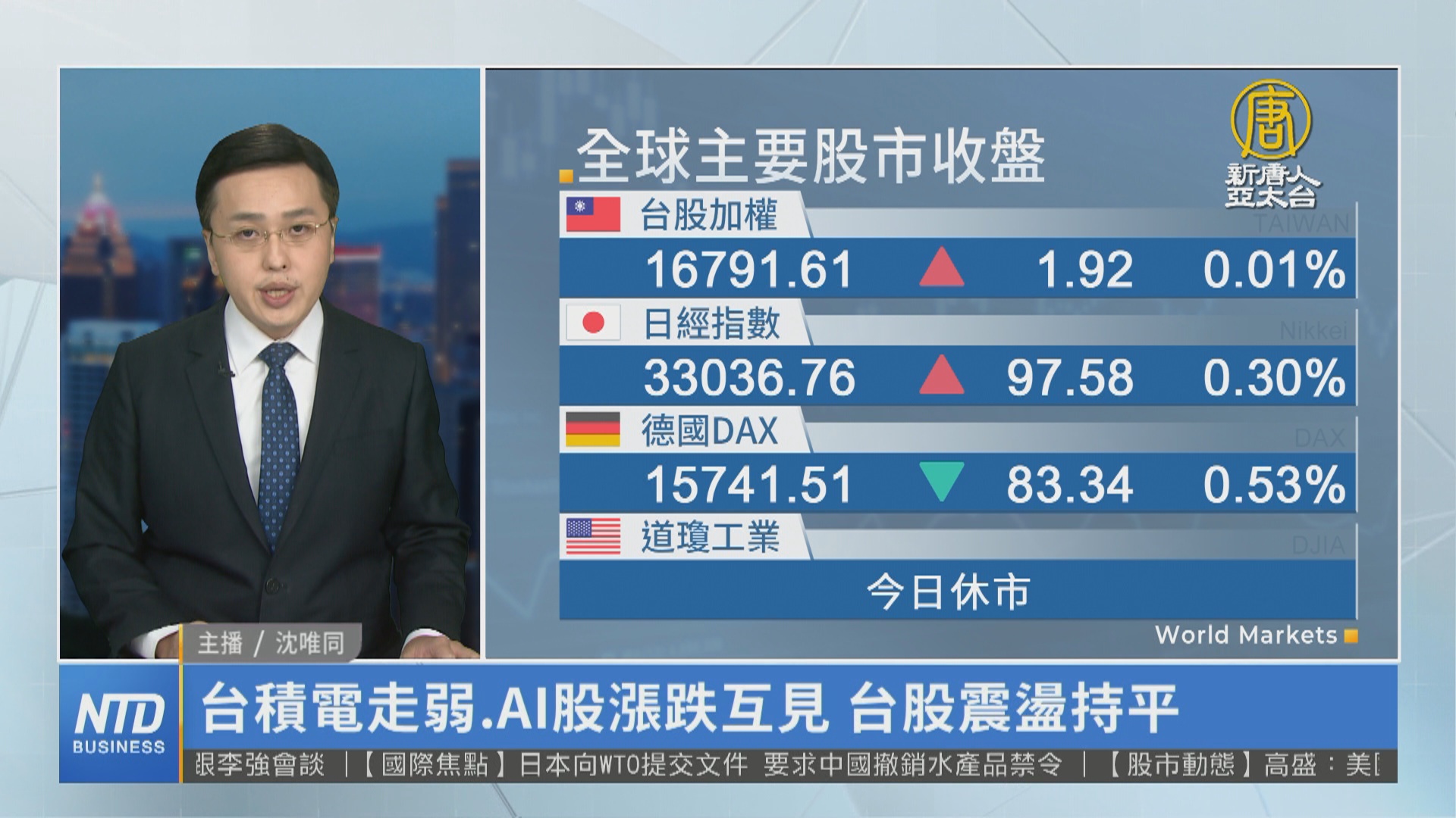 【新唐人亞太台 2023 年 09 月 05 日訊】新聞一開始帶您關心金融市場,美股周一 (4 日) 因勞動節假期休市一天,美國交易所都是休市,亞洲股市方面,日經225指數今日以紅盤開出,但過去6個交易日累計飆漲超過1,300點、引發獲利了結賣壓,終場是再度翻紅,漲幅0.30%;南韓股市今天下跌0.09%,結束連2個交易日走揚態勢。台股方面,今天呈現狹幅震盪,台積電走低,AI概念股漲跌互見,化工、光電、電子零組件、汽車等族群呈現上漲,加權指數尾盤持平收紅,收在16791.61點。