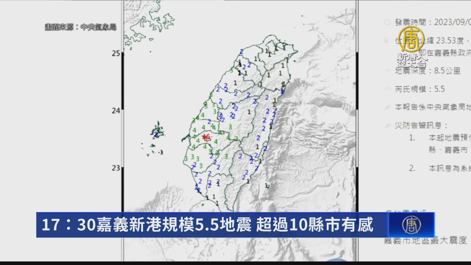 【新唐人亞太台 2023 年 09 月 05 日訊】新聞一開始,馬上帶您看到,今天傍晚又有地牛翻身!嘉義縣新港鄉,今天(5日)下午5點30分發生芮氏規模5.5的地震,震央在嘉義,地震深度有8.5公里,嘉義市最大震度5弱,全台超過10個縣市有感,還有民眾說,有先聽到地鳴聲。氣象局針對7個縣市發布防災警告,也不排除兩週內有規模4到4.5的餘震發生。而地震當下的交通影響,台中捷運一度降速,部分高鐵列車也一度停駛,延誤一個多小時,至於中科園區則沒有受到地震影響,運作一切正常。