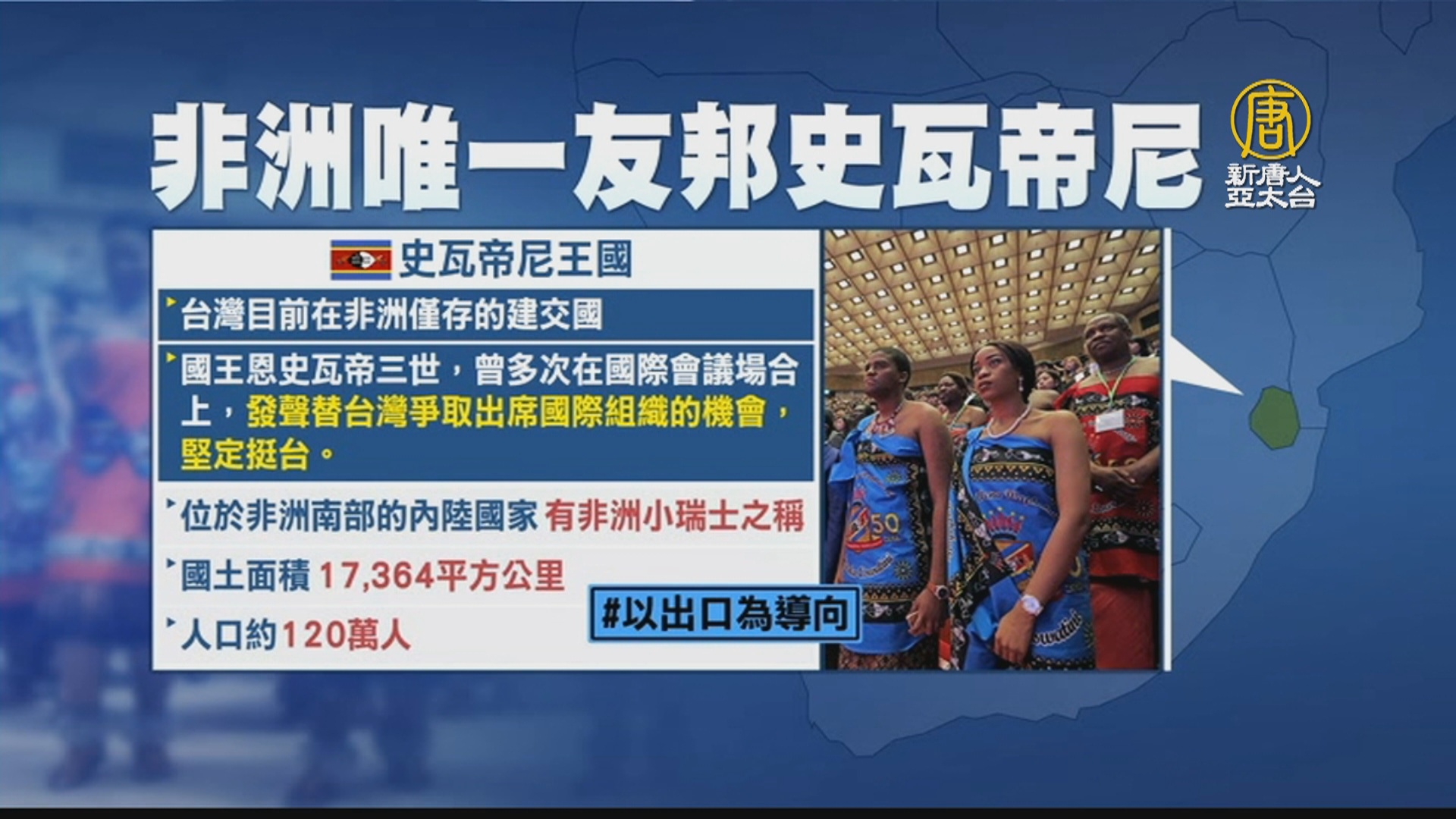 【新唐人亞太台 2023 年 09 月 05 日訊】好,帶您認識我們的非洲友邦,史瓦帝尼王國,可能有的人聽過原本的國名叫作「史瓦濟蘭」,當初是由英國人命名的,而從史國獨立建國55年以來,就與中華民國台灣邦交穩固,彼此互相扶持超過半世紀。事實上,史瓦帝尼是台灣目前在非洲僅存的建交國,國王恩史瓦帝三世,曾多次在國際會議場合上,發聲替台灣爭取出席國際組織的機會,堅定挺台。史瓦帝尼是非洲南部的一個內陸國家,有「非洲小瑞士」之稱。總面積1萬7364平方公里,人口約有120萬人,是一個以出口為導向的國家。