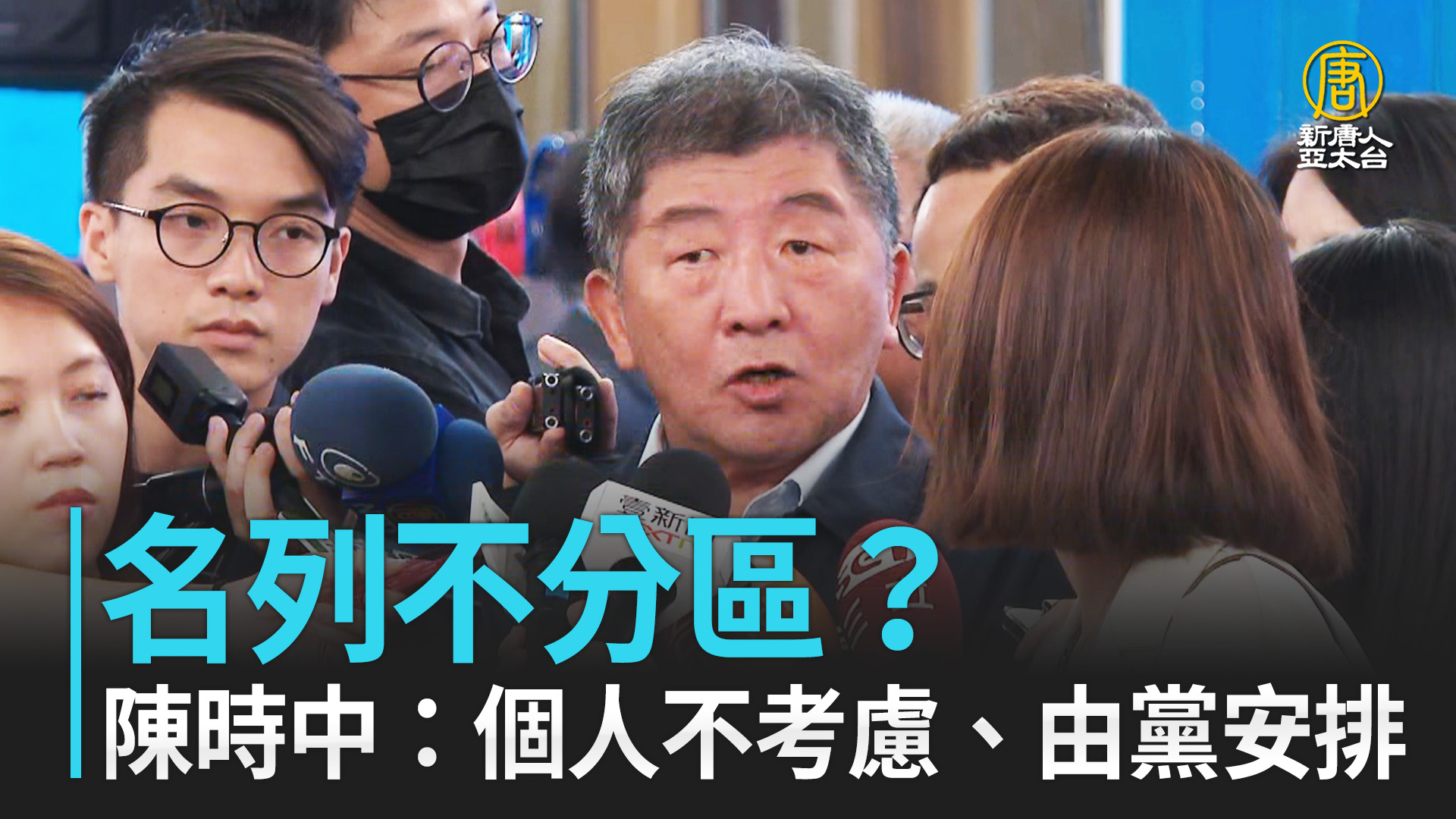 【新唐人亞太台 2023 年 09 月 05 日訊】先前有報導稱,民進黨立委不分區提名,前衛福部長陳時中將會入列,對此,陳時中今天(5日)出席賴清德台北市競選總部授證典禮,受訪時說,目前最主要考慮的是輔選總統與區域立委,並稱一切交由黨安排。