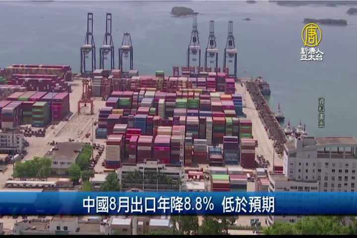 中共海關總署7 日公布的數據顯示,按美元計價,8 月出口為 2,848.7 億美元,年降 8.8%,降幅大於經濟學家預期的 9%;進口為 2,165.1 億美元,降 7.3%。