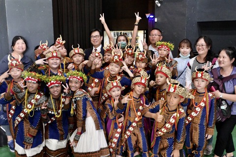 茂林國小現場帶來傳統魯凱族歌謠合唱。市長陳其邁與茂林國小合唱團學生們(高雄教育局 提供)