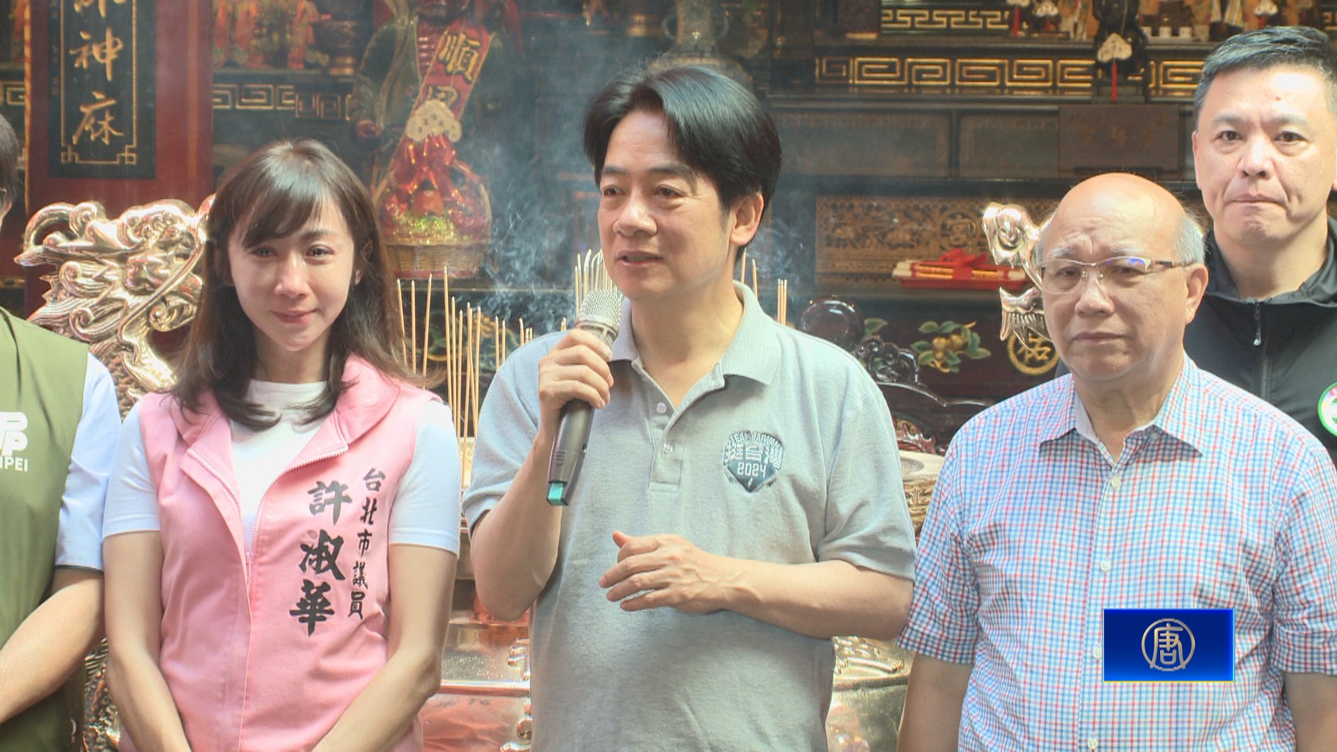 民進黨總統參選人賴清德週日(17日)行程滿檔,先到台北慈祐宮參拜,講述政見的同時,不忘拉抬一旁的立委參選人許淑華。