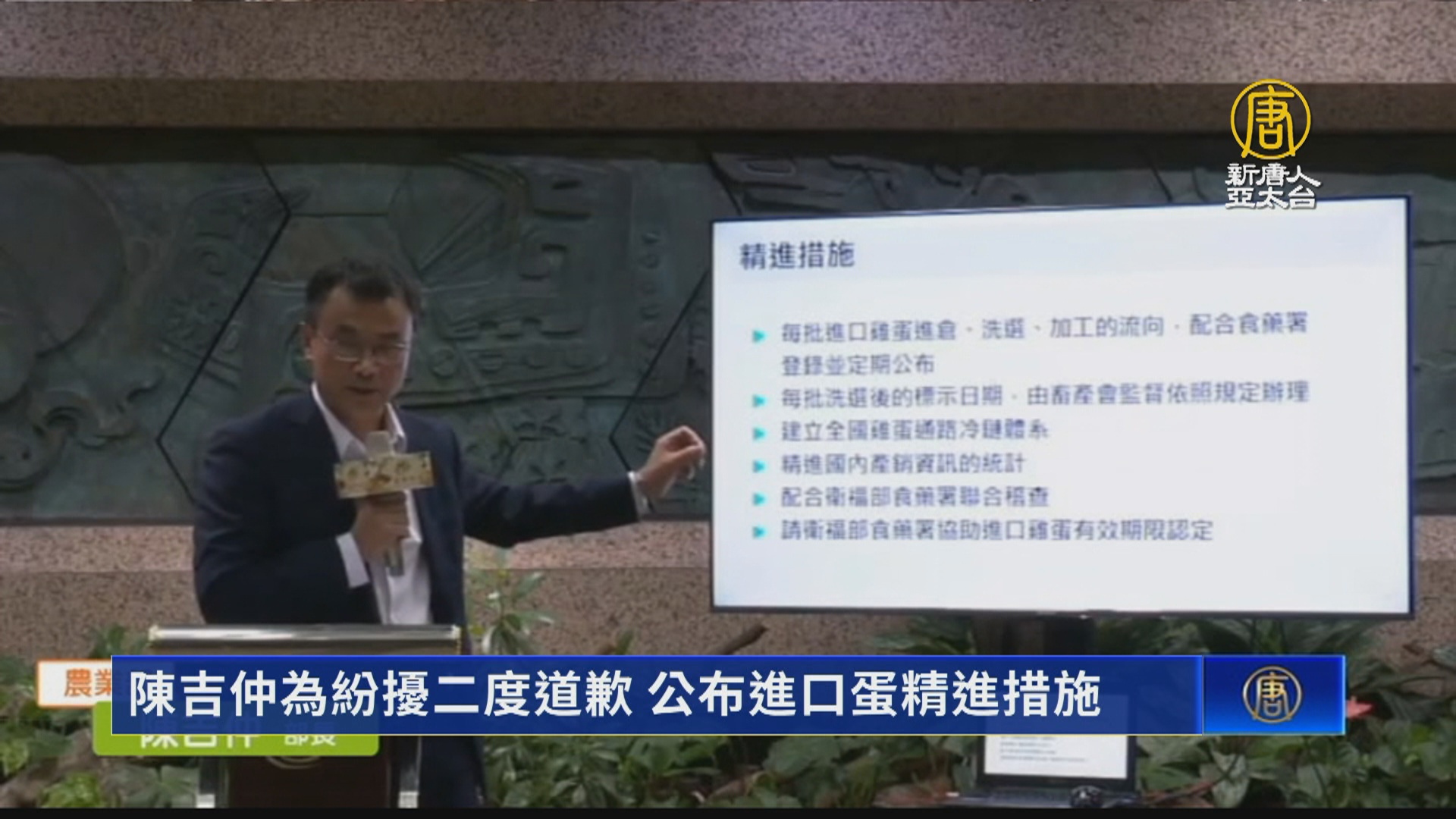 【新唐人亞太台 2023 年 09 月 19 日訊】進口蛋風波持續多日,農業部長陳吉仲在今天(19日)上午為引起社會紛擾道歉後,下午又召開記者會,再度鞠躬道歉。而除了向外界詳細說明相關的疑義以外,陳吉仲也公布了對於進口雞蛋專案的精進措施。